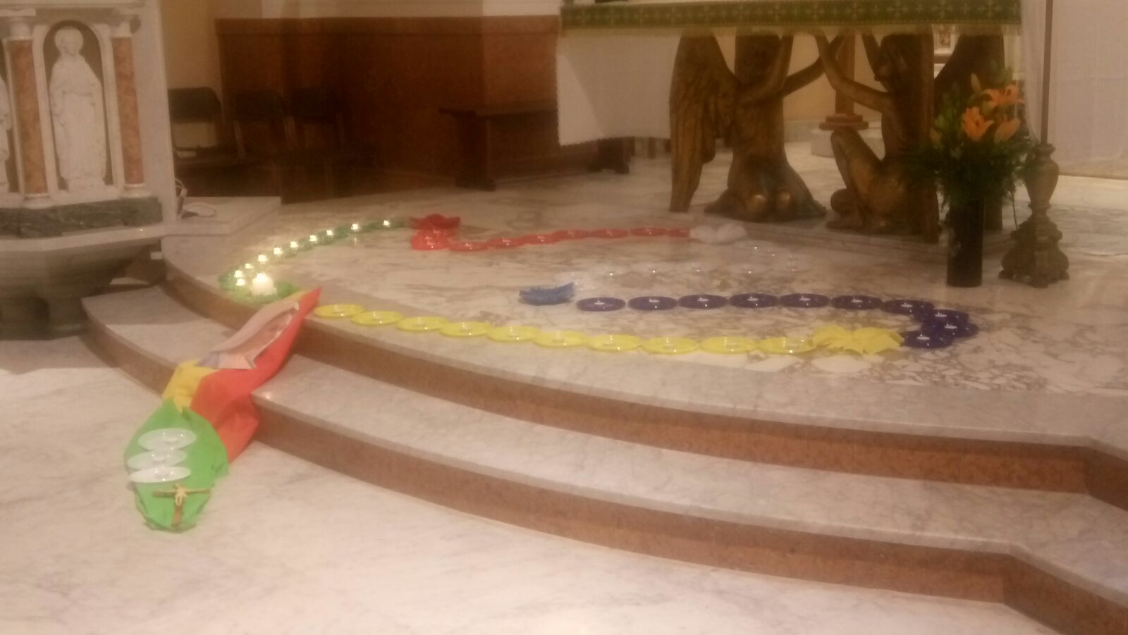 A scandire le meditazioni e la recita del santo Rosario l’accensione di candele ai piedi dell’altare con i colori dei cinque continenti, per indicare l’universalità della preghiera e la sensibilizzazione delle comunità alla pace in ogni andolo della terra.