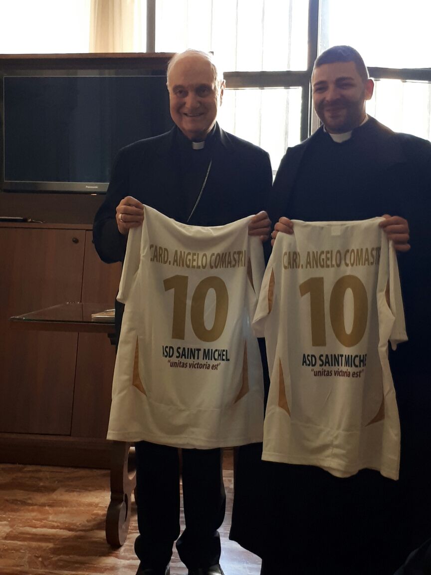 All’udienza ha fatto seguito un altro incontro ‘speciale’ : quello avvenuto, in forma privata, con il Card. Comastri –  Vicario di Sua Santità per la città del Vaticano – al quale sono stati consegnati alcuni doni. Il card. Comastri, che lo scorso anno aveva tenuto una breve catechesi su Santa Teresa di Calcutta, quale esempio di amore senza fine verso Dio e verso il prossimo, ha quest’anno parlato al gruppo di Maria, la nostra Mamma Celeste ricordando come Ella venne donata  a noi tutti come Madre proprio da Gesù sul Golgota. ‘Stabat Mater’ scrive Giovanni: la Madonna era lì accanto a Gesù, fedele fino alla fine! Gesù sapeva che il cuore di Maria era pieno d’Amore, pieno di Dio  ed è per questo che – dice il Cardinale – era un cuore da donare. Per questo Gesù dice : ‘Donna ecco tuo figlio’ , fagli da madre , e chiaramente in Giovanni ci siamo tutti noi! «L’amore della mamma – continua Comastri – è l’amore che più si avvicina, rassomiglia  all’amore di Dio. E la Madonna ha una capacità straordinaria di avvicinare le persone al Signore» come testimoniano alcune storie di conversione di personaggi illustri. «Giosuè Carducci, non era certamente un credente praticante – dice il Cardinale –  ed arrivò addirittura a comporre un inno a Satana, una poesia terribile per esaltare il libero pensiero con spirito anticlericale. Eppure, di fronte a Maria egli si arrende e nelle Odi Barbare arriverà a scrivere: Ave Maria! Un’altra storia di conversione straordinaria è quella del medico – scienziato Alexis Carrel che a Lourdes davanti all’ inspiegabile guarigione di Maria Ferrand, affetta da peritonite tubercolare, dirà dal profondo del suo cuore: ‘Vergine benedetta, io ho fiducia in Voi’! Ed ancora  quella di Giovanni Papini, ateo e propugnatore dell’ateismo, scrisse contro Dio, ma una volta riconosciuto Gesù, grazie anche all’amico Domenico Giuliotti, scrisse parole bellissime». Un percorso interiore, lungo e tormentato, che lo stesso scrittore aveva difficoltà a ripercorrere ma che il Cardinale ha raccontato con grande semplicità. Alla fine dell’incontro, Mons. Comastri ha ancora una volta omaggiato tutti i presenti di alcuni doni. Ai calciatori della Saint Michel ha in particolar modo voluto donare la coroncina del Rosario ed inoltre ha chiesto ad alcuni collaboratori che il gruppo fosse accompagnato in visita alla Basilica Vaticana affinchè potesse ammirare la bellezza del Crocifisso ligneo ivi presente, un’opera di grande valore artistico e da poco restaurato.