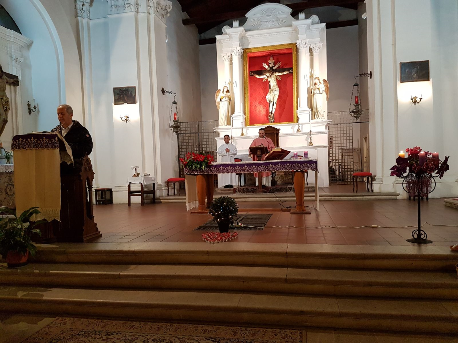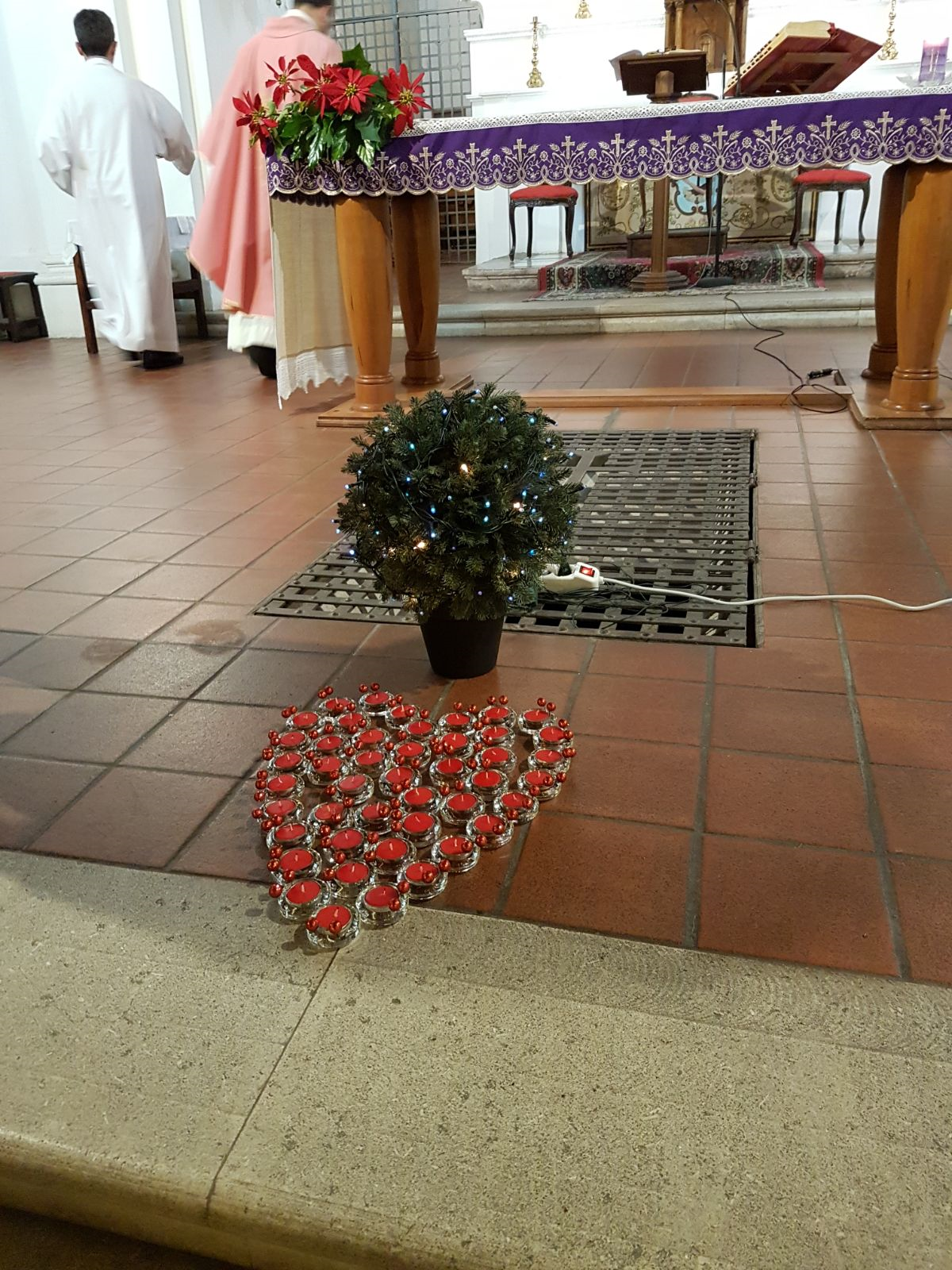 Dietro il cuore abbiamo posto un simbolo del Natale con le luci… E può accadere – come è accaduto domenica e sempre accade – che la Messa, la memoria del sacrificio del Redentore, la festa del Figlio di Dio che per noi è morto e risorto diventi più che mai “incontro”, gioia di essere miti strumenti del Dio della misericordia e della pace… Che sia così!
