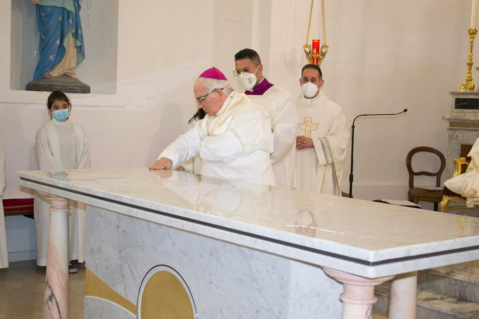 Come lo stesso Vescovo Mons. Milito ha sottolineato in un’intensa omelia, l’ altare non deve essere inteso come un oggetto astratto bensì come “cattedra di chi esercita in nome del Signore una funzione di insegnamento”, l’altare come cattedra da cui la Parola percorre i cuori per tramutarsi in opere. Si è poi dato corso alla consacrazione dell’altare, che è stato unto con il Sacro Crisma ed incensato, profumi che hanno avvolto la comunità solennemente partecipe. È stato quindi rivestito delle tovaglie ed ornato con fiori e ceri che il Diacono Michele Vomera ha acceso con il cero portogli dal Vescovo accompagnato da un intenso applauso dei presenti.