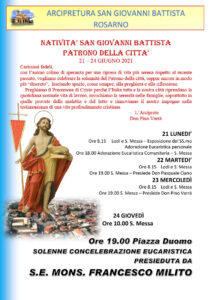 Il programma prevede diverse celebrazioni per il triduo che ha inizio il 21 giugno con le Lodi e la Santa Messa delle ore 8.15, mentre il 24 giugno, alle 19.00 il vescovo Milito presiederà la Santa Messa in piazza Duomo.