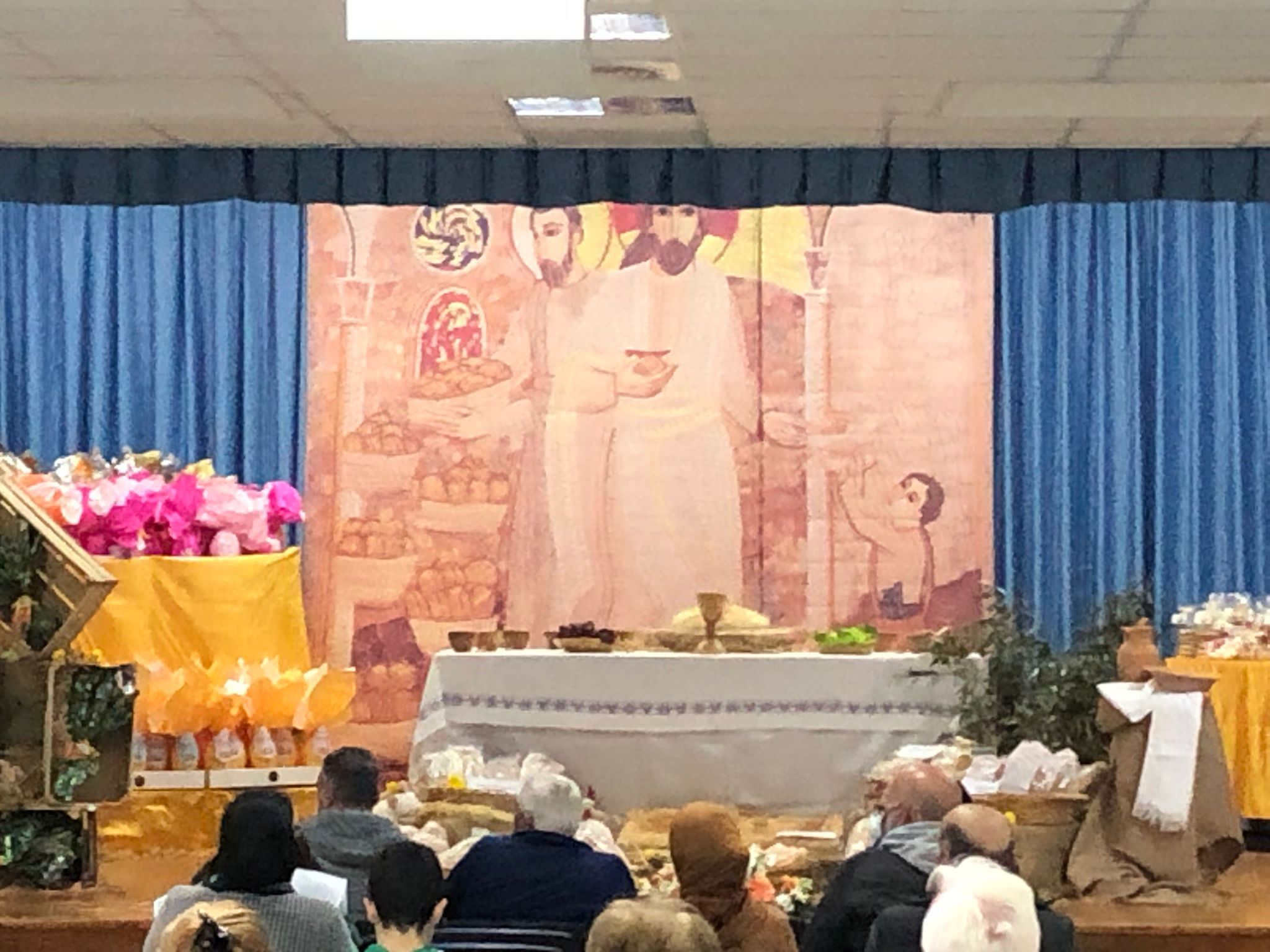 Fasci di colore giallo e blu a rappresentare il popolo ucraino, a cui il Parroco Don Giuseppe Sofrà ha teso la mano fin dai primi giorni del loro arrivo a Palmi, assieme al prezioso aiuto del Diacono Don Vincenzo Condello. Numerosi i segni cristiani: dal grano all’ulivo, dalla moltiplicazione dei pani e dei pesci a una tavola imbandita con dodici calici, a simulare l’Ultima Cena, ed al centro il Pane, benedetto da Don Sofrà.