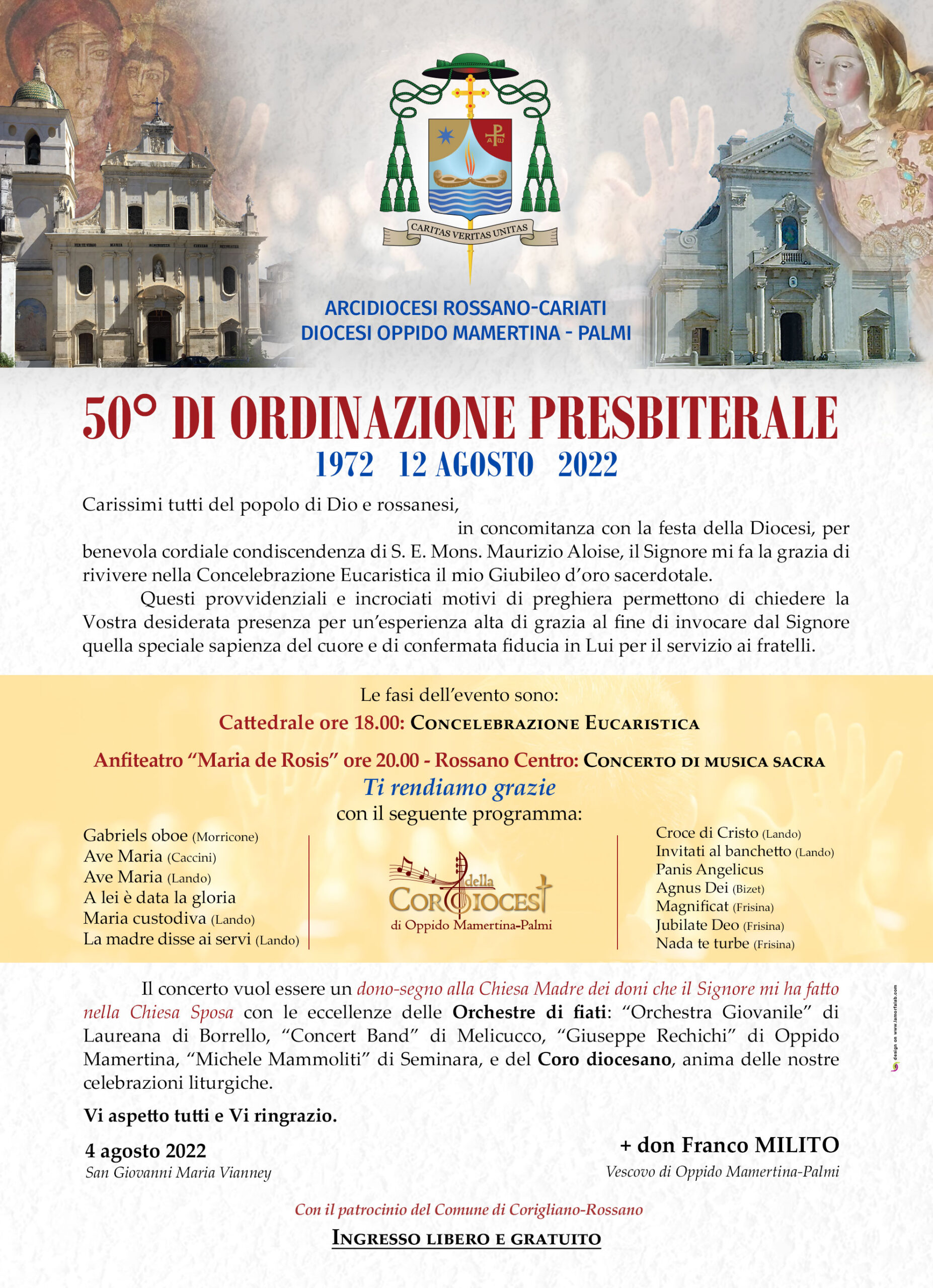 Il concerto vuol essere un dono-segno alla Chiesa Madre dei doni che il Signore mi ha fatto nella Chiesa Sposa con le eccellenze delle Orchestre di fiati: “Orchestra Giovanile” di Laureana di Borrello, “Concert Band” di Melicucco, “Giuseppe Rechichi” di Oppido Mamertina, “Michele Mammoliti” di Seminara, e del Coro diocesano, anima delle nostre celebrazioni liturgiche. Vi aspetto tutti e Vi ringrazio.