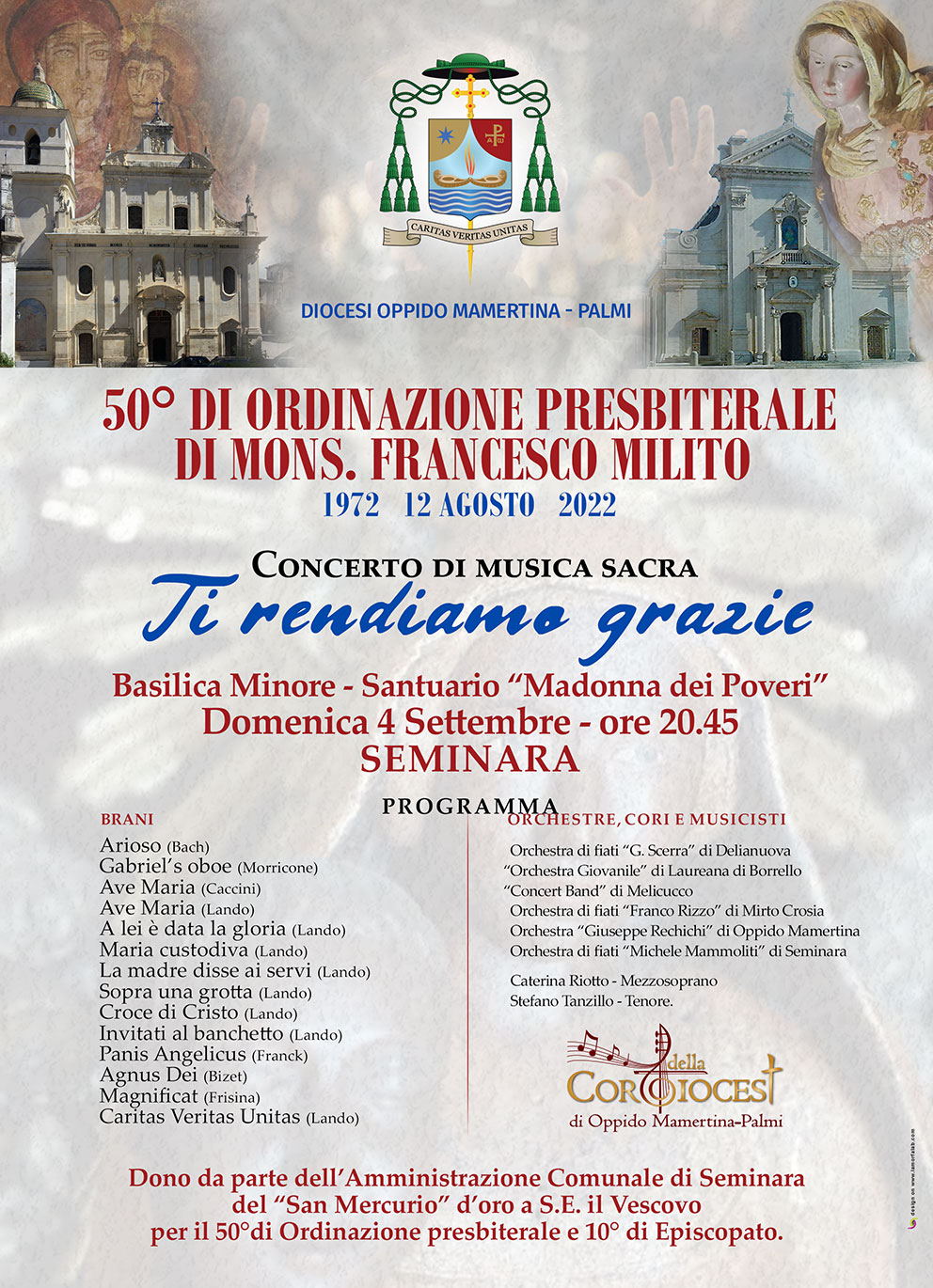 Durante l’evento l’Amministrazione Comunale di Seminara donerà il “San Mercurio” d’oro a S.E. il Vescovo per il 50°di Ordinazione presbiterale e 10° di Episcopato.