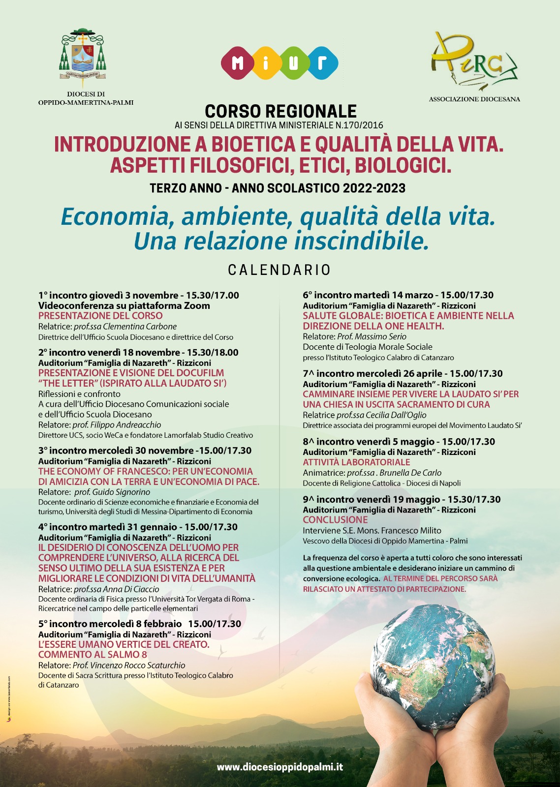 Il sottotitolo scelto per l’anno in corso è Economia, ambiente, qualità della vita. Una relazione inscindibile, gli argomenti verteranno sull’economia di Francesco, la custodia e la salvaguardia della vita del creato e della vita umana.