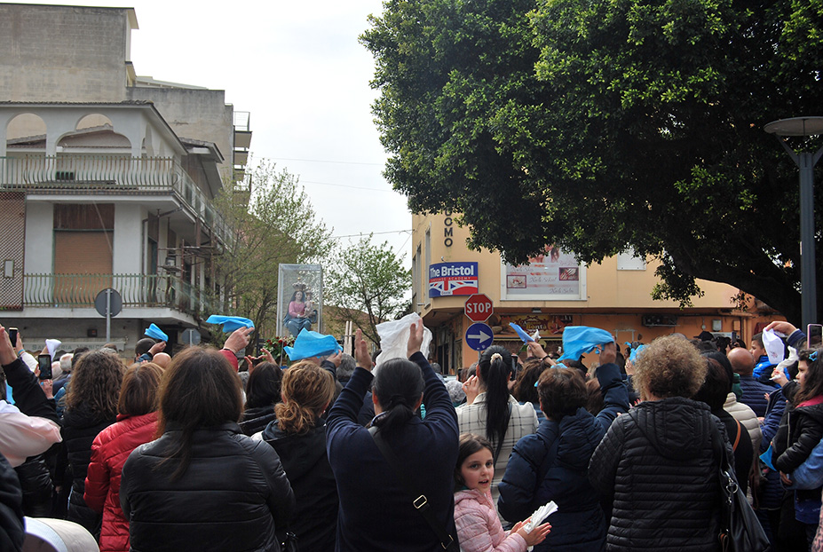 Il cammino spirituale verso Polsi viene percorso ogni anno da migliaia di fedeli, sin dalla fine di agosto e per tutto il mese di settembre, i pellegrini risalgono le strade dell’Aspromonte, dal Tirreno e dallo Jonio per vivere la veglia, fatta di litanie, preghiere, canti e balli, i fedeli fanno a gara per partecipare alle novene, richiedere grazie, fare voti, alzano il proprio figlio fino a sfiorare le vesti di pietra della Madonna, si levano così ogni giorno inni di invocazione e riconoscenza verso la Madre Celeste che ascolta e non delude mai i Suoi figli. In passato si arrivava al santuario a piedi, a dorso di muli e cavalli percorrendo selciati stretti e ripidi, oggi le carovane di pellegrini sono organizzate anche con piccoli autobus che risalgono la montagna al ritmo di canti e preghiere, ma la Madonna stavolta ha voluto raggiungere personalmente i suoi figli e la melodia del Suo peregrinare è partita nella Diocesi di Oppido Mamertina-Palmi dalla Parrocchia Sant’Ippolito Martire a Gioia Tauro. La statua della Vergine è giunta l’undici aprile ed un caldo sole e la musica dei caratteristici tamburelli ha accompagnato il Suo arrivo, ad accoglierla il Parroco Don Antonio Scordo, le istituzioni presenti ed una folta comunità gioiosa ed emozionata.
