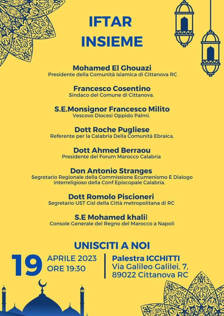 “Insieme per la celebrazione dell’IFTAR”, il pasto serale consumato dai musulmani che interrompe il loro digiuno quotidiano durante il mese islamico del Ramadan. Iniziativa significativa della Comunità islamica della Piana di Gioia Tauro che ha organizzato la sera del 19 aprile presso la palestra Icchitti di Cittanova per la conclusione del Ramadan un incontro con la partecipazione di importanti autorità civili e religiose e tra queste Don Antonio Stranges, Segretario Regionale della Commissione Ecumenismo e Dialogo interreligioso della Conferenza Episcopale Calabra e il nostro Vescovo S.E. Mons. Francesco Milito.
