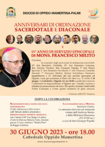 Carissimi, in occasione degli anniversari di ordinazione (sacerdotale: 60° don Benedetto Ciardullo; 10° don Domenico Loiacono, don Antonio Nicolaci, don Giuseppe Papalia; 9° don Emilio Sponton; 2° don Domenico Sorridente, 1° don Vincenzo Condello; diaconale: 7° Francesco Multari, Stefano Scicchitano, Domenico Sgambitterra) e 11° dell’inizio del mio servizio episcopale ad Oppido, come già accennato al Ritiro del clero u.s., Vi invito il 30 giugno, in Cattedrale a Oppido alle ore 18.00 a condividere insieme i sentimenti di ringraziamento al Signore per i benefici concessi e chiedere la perseveranza nel dono. Per questo, invitate i fedeli delle Vostre Comunità a vivere questo momento di gioia comune.