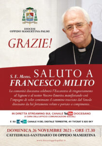 La Diocesi di Oppido Mamertina – Palmi si prepara a concludere il ministero pastorale di mons. Francesco Milito con una Messa di Saluto e Ringraziamento che si terrà il Domenica 26 novembre, Solennità di Cristo Re, alle ore 17.30 nella Cattedrale-Santuario di Oppido Mamertina.