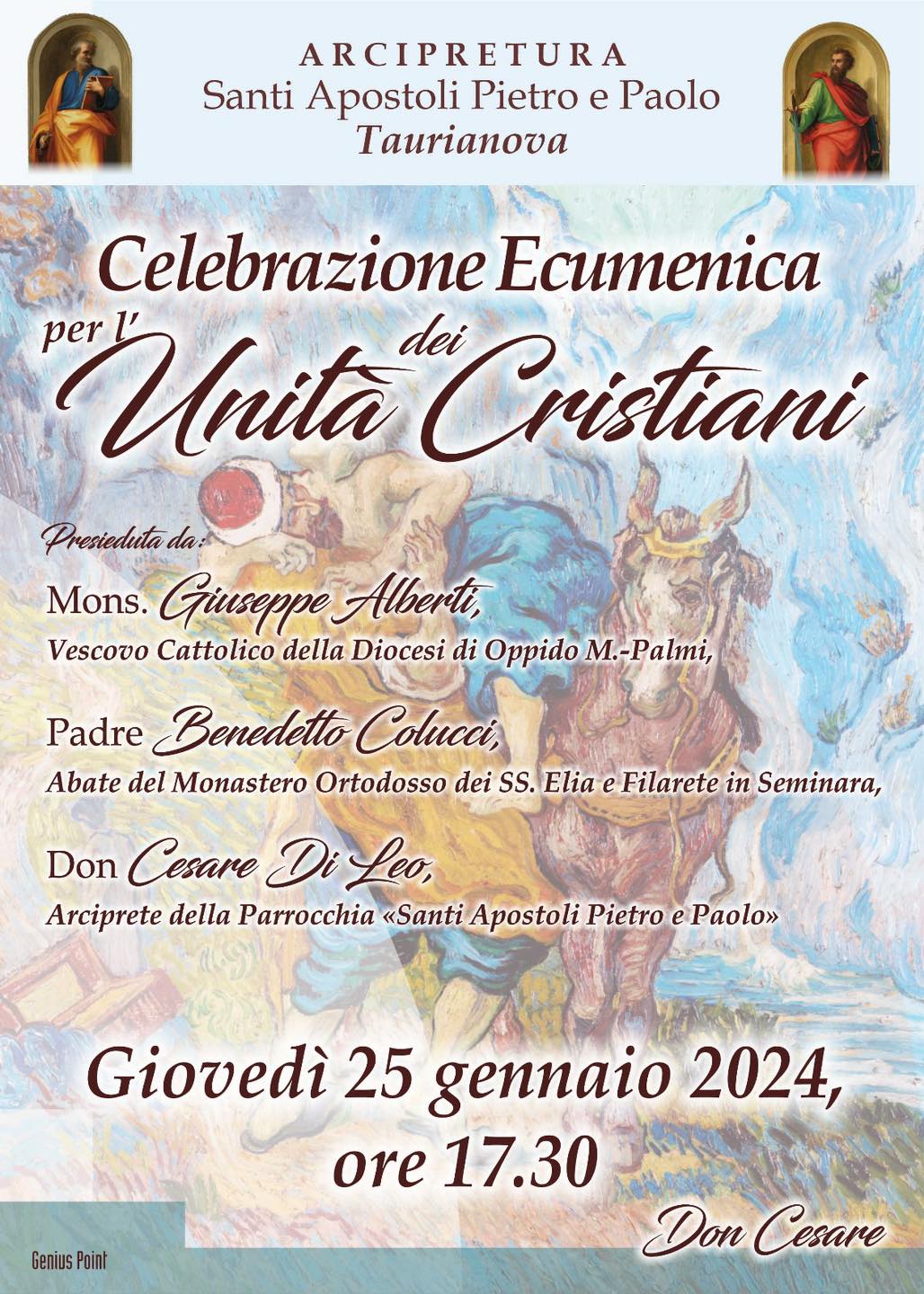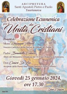 Nel contesto della settimana di preghiera per l’unità dei cristiani di quest’anno 2024, che si celebra di consueto dal 18 al 25 Gennaio, si è pensato, a conclusione della stessa, di ascoltare le voci delle Chiese sorelle che per dottrina e tradizione sono le più vicine alla Chiesa di Roma con una solenne celebrazione Ecumenica che si terrà il 25 Gennaio (festa della conversione di San Paolo) alle ore 17.30 presso l’Arcipretura dei SS. Apostoli Pietro e Paolo in Taurianova.