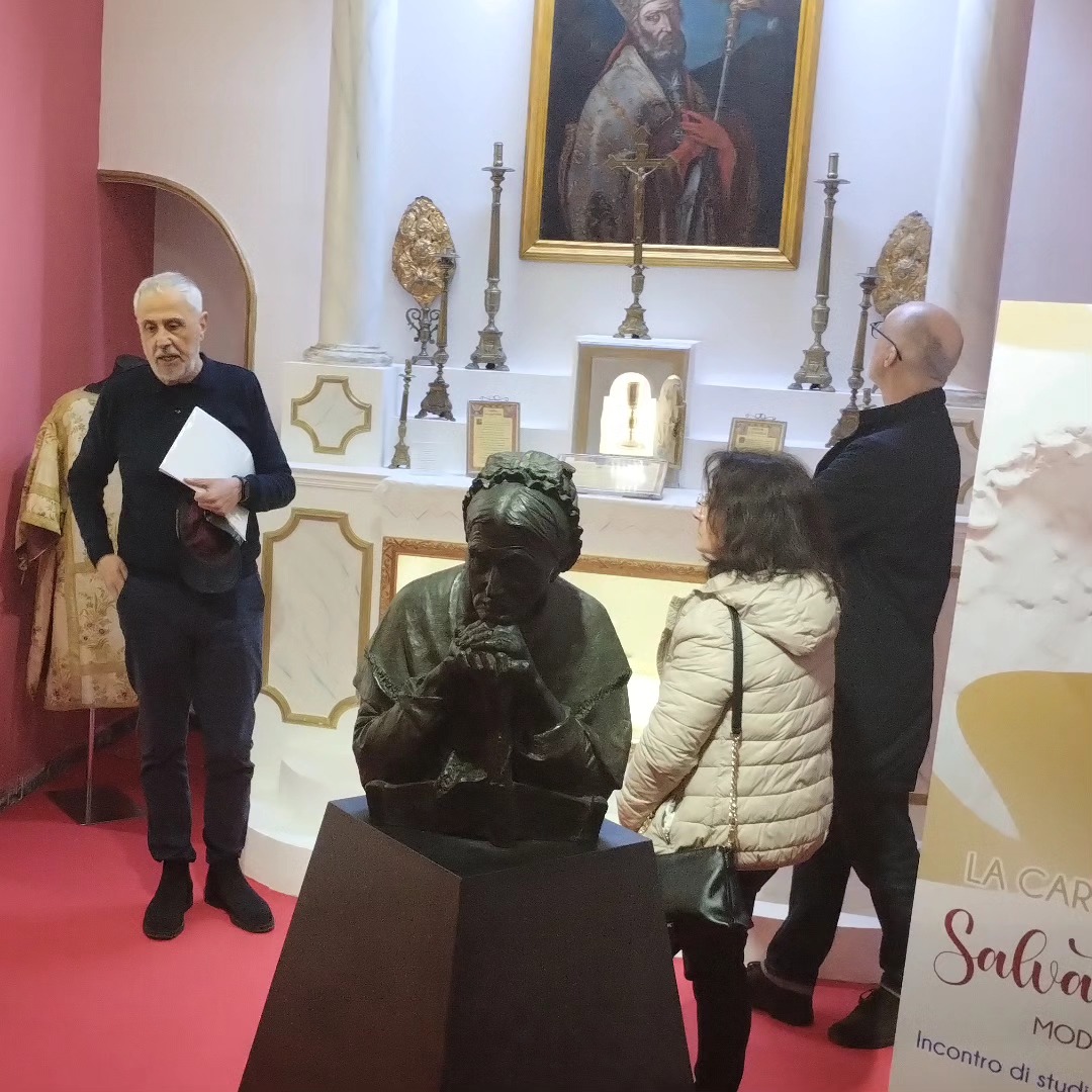 Il viaggio ha avuto inizio davanti all’incantevole e grazioso calco in gesso dell’Angelo di Salvatore Albano, artista oppidese di fama mondiale dell’800. La figura mite e graziosa, dedicata alla veglia della tomba della madre dell’artista, non teme di mostrare accanto alle proprie caratteristiche angeliche anche un velato corpo umano di donna, ponendosi così tra cielo e terra ad accogliere i visitatori.