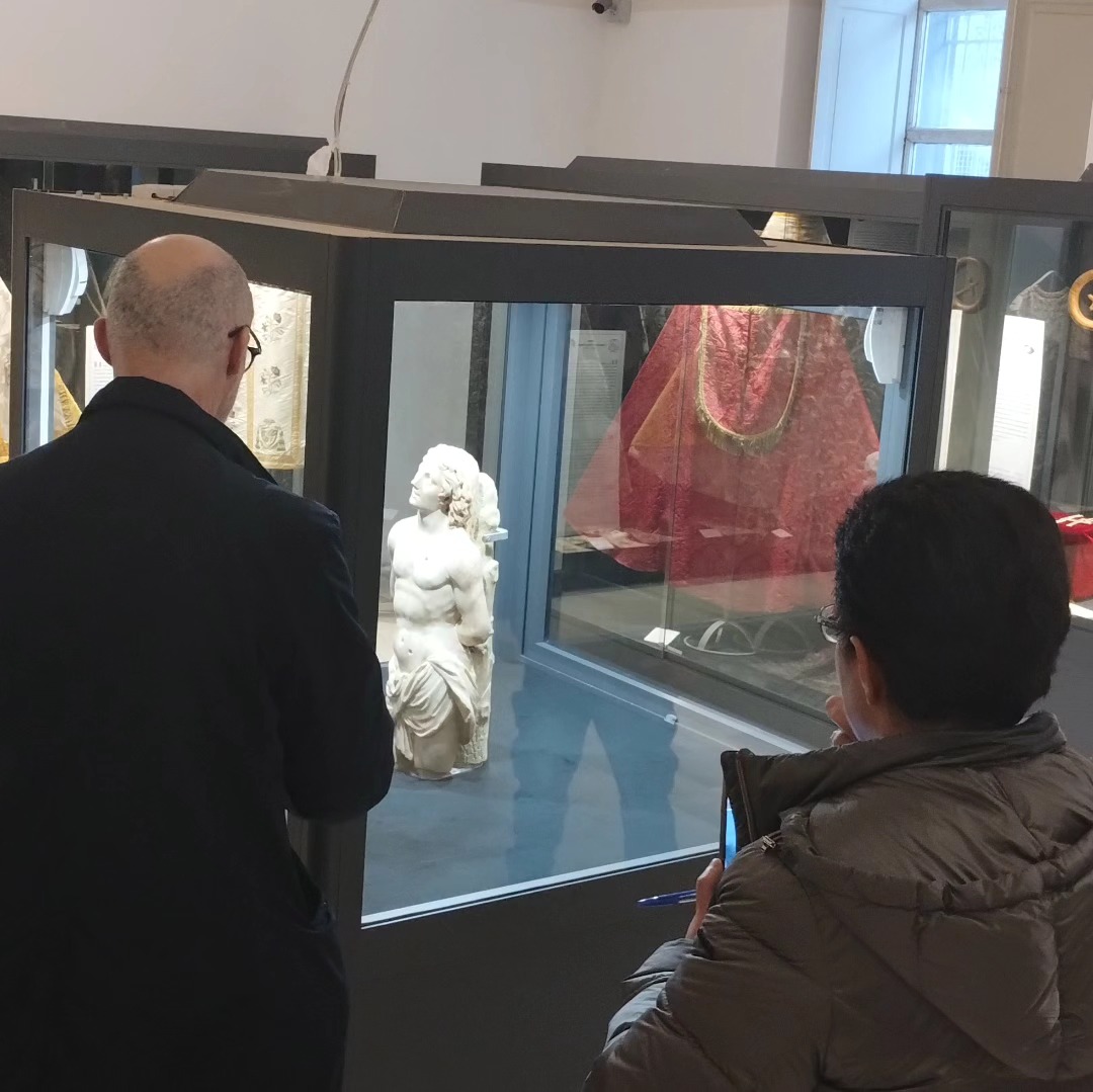 Nella fase conclusiva abbiamo visitato la sala forse più suggestiva, che vede al proprio centro l’ammiratissima opera marmorea di San Sebastiano, realizzata da Benedetto da Maiano (del quale si ipotizza un legame diretto con grande Michelangelo Buonarroti) nella seconda metà del XV secolo, circondata da mitrie, pianete e piviali, ricamati da chissà quali raffinate e delicate mani. La storia dei grandi vescovi oppidesi circonda il santo martire, che attira e stupisce per l’incisiva bellezza.