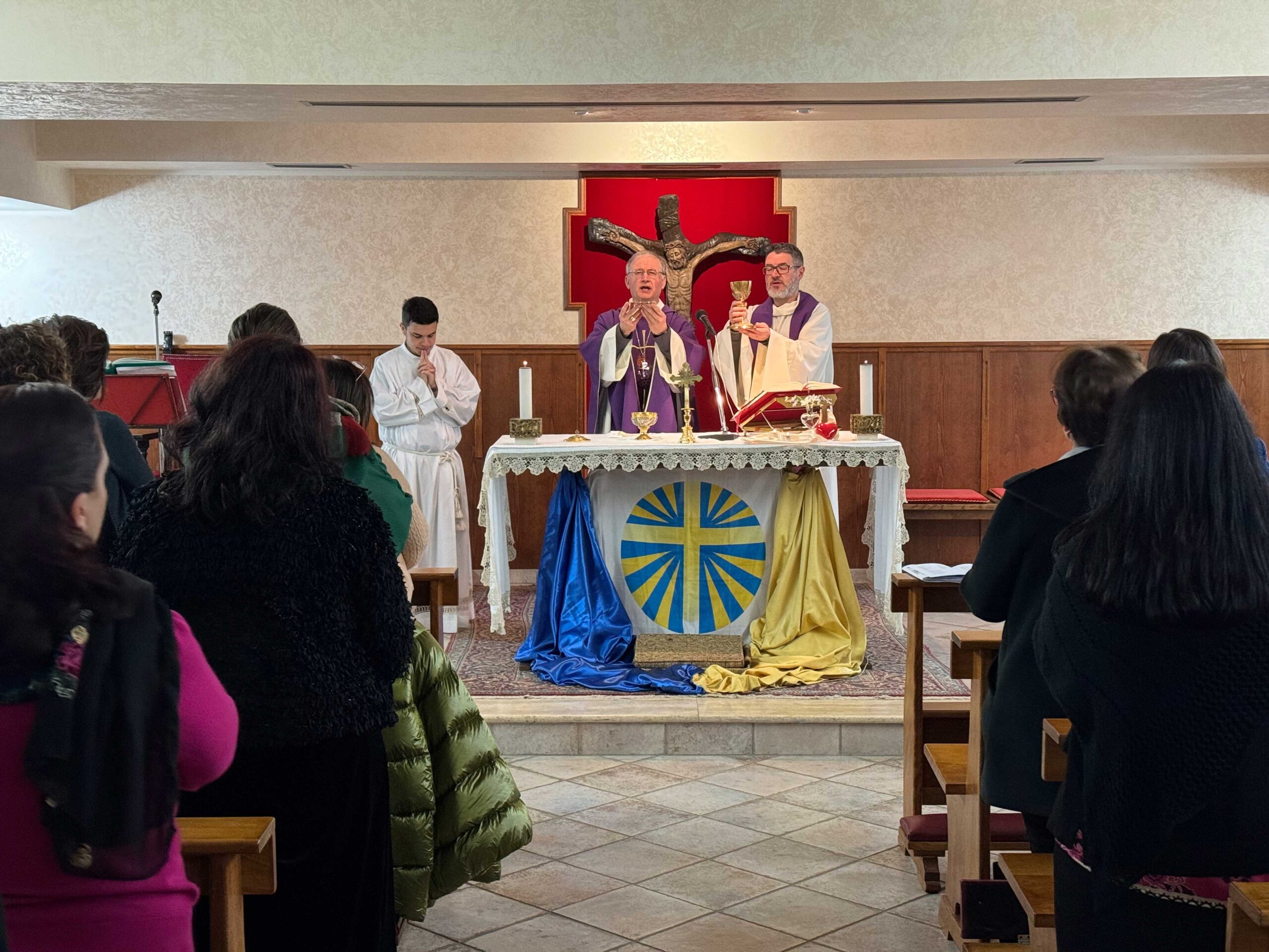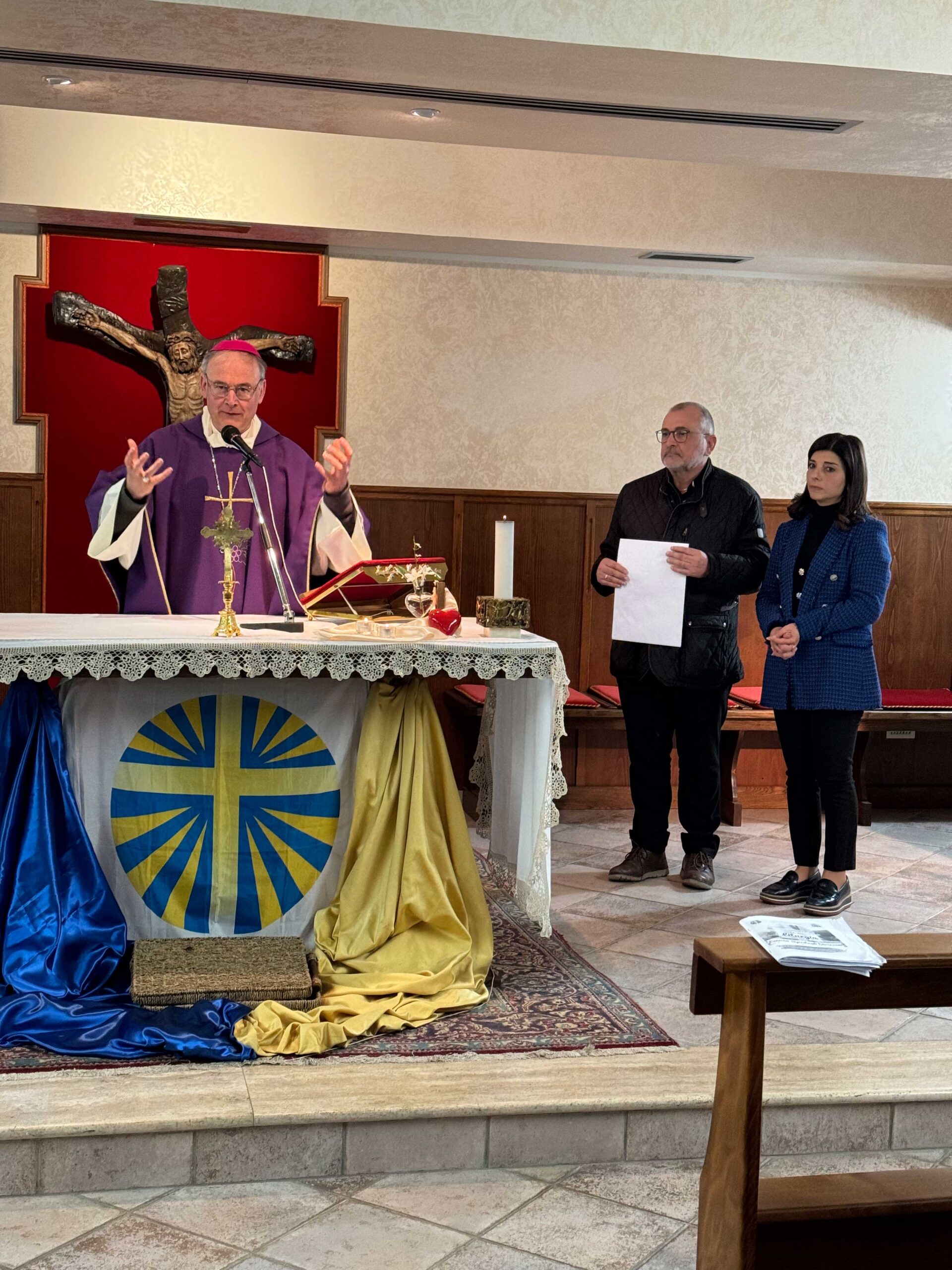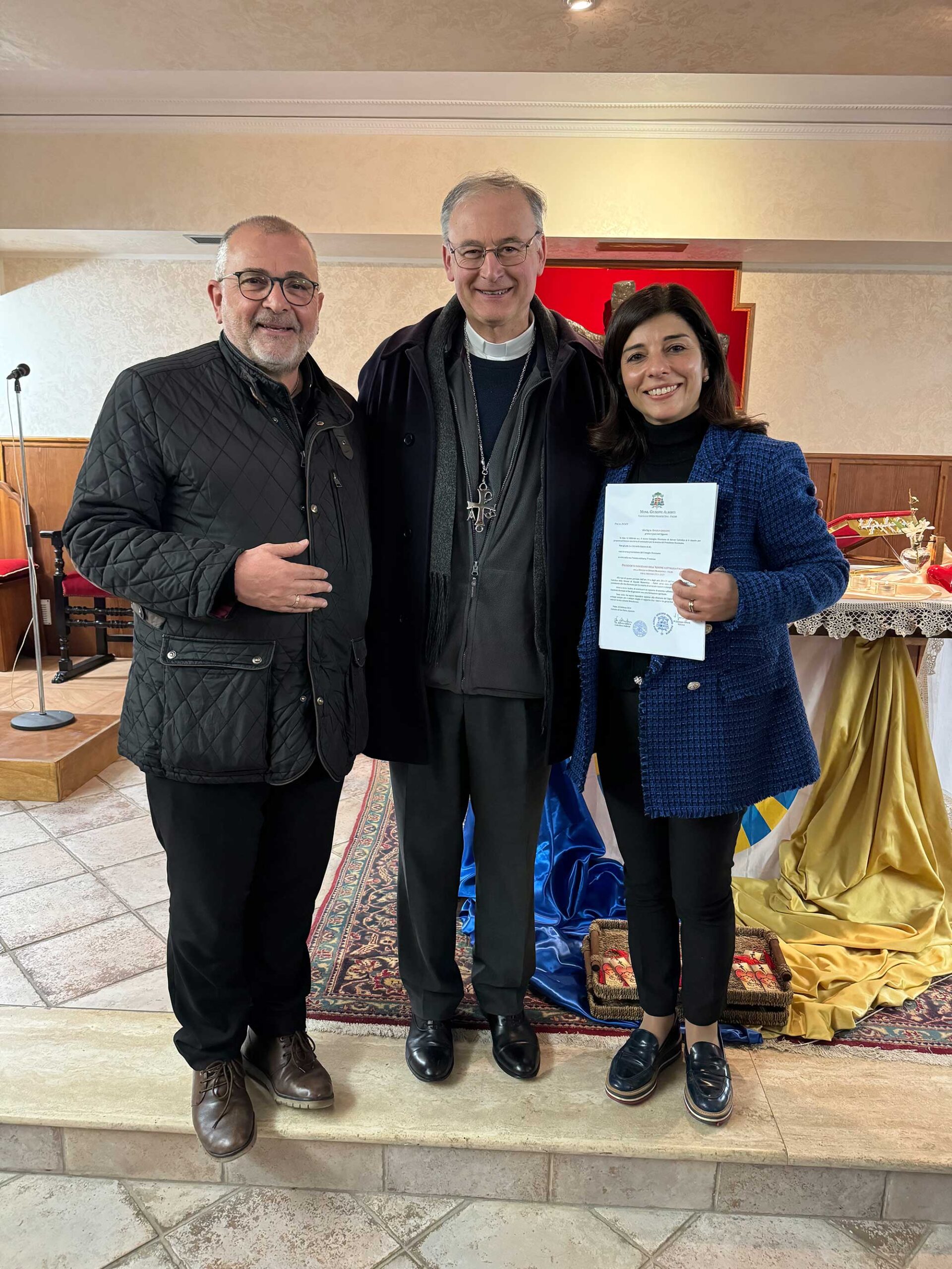 “Ritornate a me con tutto il cuore”, tematica affrontata e sviluppata egregiamente con delle meditazioni molto esaudienti per i partecipanti, con momenti ricchi di emozioni, intervallate dai momenti di deserto e di riflessione personale, senza tralasciare la preghiera: dalle lodi mattutine, ai Vespri e la Santa Messa, fino alla consueta Via Crucis, ormai emblema degli esercizi diocesani, una via crucis improntata sul bene e sul male, sfaccettature del cuore di chi vive storie di allontanamenti e di ritorni, fino alla toccante ed avvincente Adorazione Eucaristica Comunitaria che ha toccato il cuore di tutti, per poi proseguire con l’adorazione notturna fino a Domenica Mattina! Trovarsi faccia a faccia con Gesù Eucarestia, fissare lo sguardo in quel bianco purissimo, in quella particola bianca, cuore puro che abbraccia e invita i cuori a ritornare a Lui. La gioia di fermare gli occhi e il cuore nella perfezione assoluta, trasforma il silenzio in canto dentro l’anima. E mentre la notte, in quella danza di emozioni, si è vista lentamente dissolvere, ecco l’alba dell’ultimo giorno di esercizi irrompere impetuosa dinanzi allo spettacolo dell’amore, con l’ultima Meditazione, i colloqui personali, le confessioni, le conversazioni spirituali divisi in gruppi, e con la Celebrazione della Santa Messa domenicale presieduta dal Vescovo Mons. Giuseppe Alberti, da Don Tony e dall’Assistente Unitario Don Antonio Spizzica, al termine della quale, il nostro Vescovo ha consegnato ufficialmente, ad Angela Giuliano, la nomina a Presidente diocesano dell’Azione Cattolica per il triennio 2024-2027.