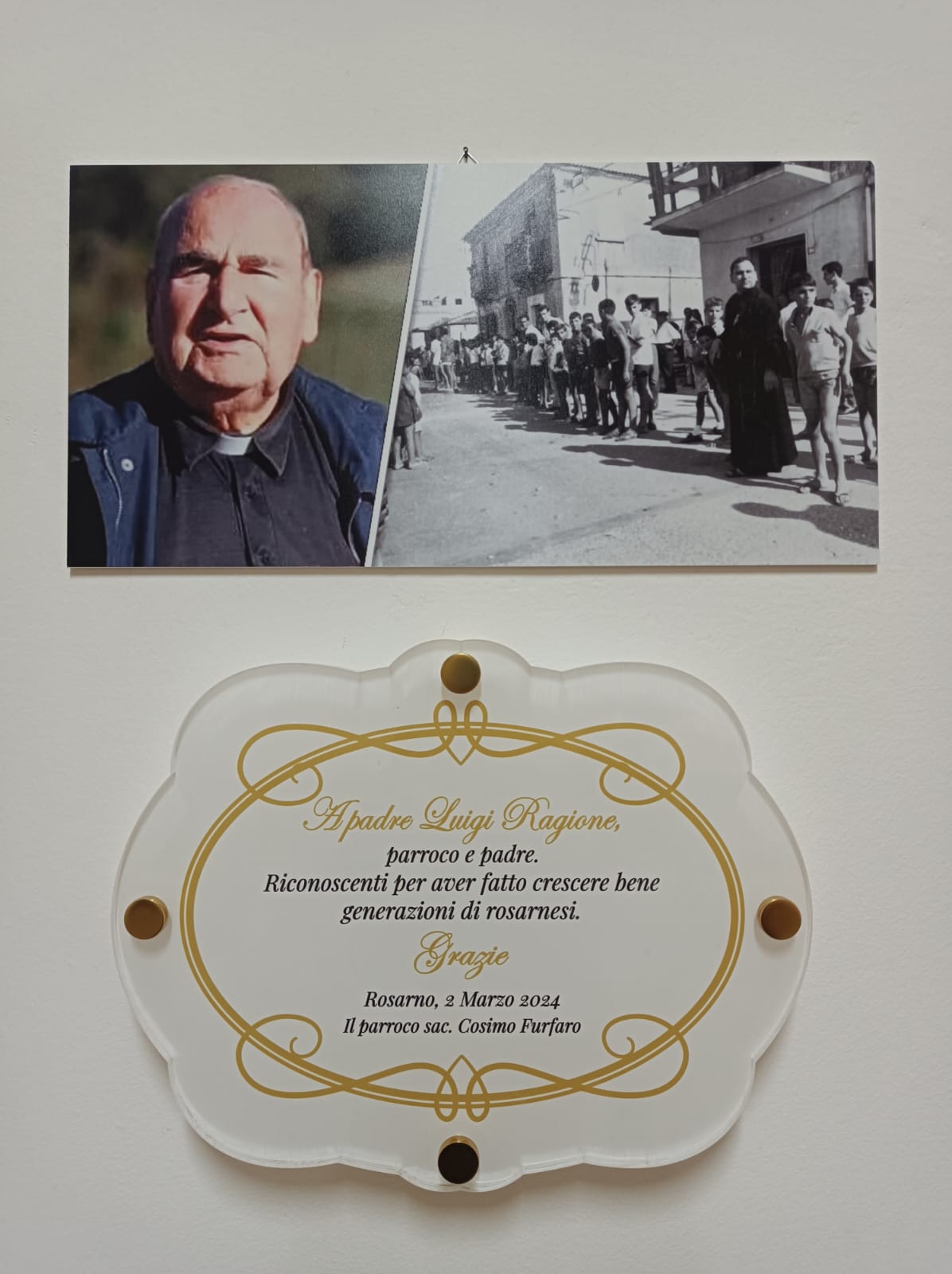 Dopo la Messa nel salone parrocchiale, don Cosimo ha scoperto la targa ricordo come riconoscenza a padre Luigi per essere stato padre di generazioni di rosarnesi. All’amministrazione, che ha accolto con favore, è stata fatta richiesta anche l’intitolazione di una via adiacente la chiesa.