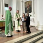 Alla fine della celebrazione la Comunità ha fatto un piccolo pensiero a Sua Eccellenza regalandogli una Sacra Famiglia in resina, accompagnata dalle parole di una coppia provata dal lutto per la morte del figlio che ha sottolineato l’importanza dell’aiuto della Sacra Famiglie per tante famiglie che, dopo la morte del proprio figlio, non trovano la ragione del loro stare insieme e spesso si dividono e un Angelo con un’ala soltanto in ceramica, accompagnato dal pensiero di don Tonino Bello: “Gli uomini sono angeli con un’ala soltanto, possono volare solo rimanendo abbracciati. E oso pensare, Signore, che anche Tu abbia un’ala soltanto, l’altra la tieni nascosta… forse per farmi capire che Tu non vuoi volare senza me. Per questo mi hai dato la vita, perché io fossi tuo compagno di volo. Ma non basta saper volare con Te, Signore: Tu mi hai dato il compito di abbracciare anche il fratello, e aiutarlo a volare. Ti chiedo perdono, perciò, per tutte le ali che non ho aiutato a distendersi: non farmi più passare indifferente davanti al fratello che è rimasto con l’ala, l’unica ala, inesorabilmente impigliata nella rete della miseria e della solitudine e si è ormai persuaso di non essere più degno di volare con Te: soprattutto per questo fratello sfortunato dammi, o Signore, un’ala di riserva”.