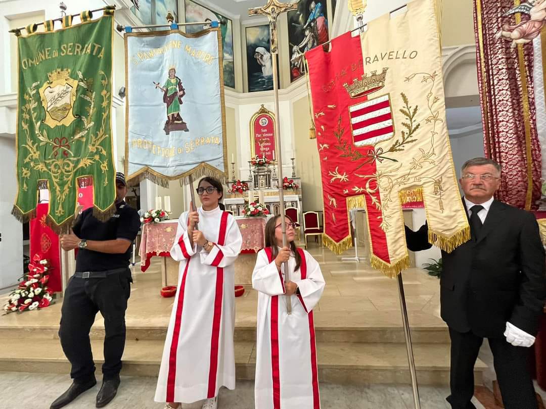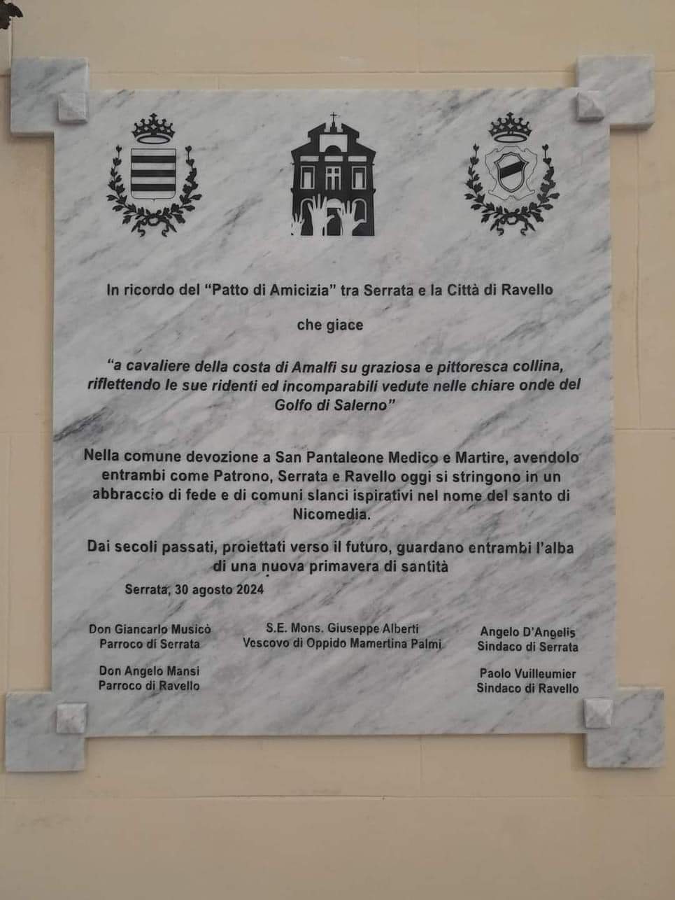 Si è svolto in clima di festa e di gioia il 30 agosto scorso il Patto di Amicizia tra Serrata e la Città di Ravello nel nome del comune patrono San Pantaleone Medico e Martire. A rappresentare la Città di Ravello c’era una scelta delegazione proveniente dalla Città della Costa Amalfitana guidata dal Sindaco Paolo Vuilleumier e il Parroco di Ravello Don Raffaele Ferrigno. Il Patto di Amicizia, ideato dal Parroco di Serrata Don Giancarlo Musicò con l’appoggio e il patrocinio dell’Amministrazione Comunale di Serrata, si è aperto con l’accoglienza della delegazione ravellese all’inizio del paese dove si è inaugurata e benedetta una nuova grande targa all’interno della quale sono stati messi in relazione le immagini più suggestive di Ravello e di Serrata e le due raffigurazioni del santo patrono San Pantaleone: il busto argenteo di Ravello e la statua lignea, recentemente restaurata, di Serrata, opera di fine 700’ del famoso scultore calabrese Domenico De Lorenzo.