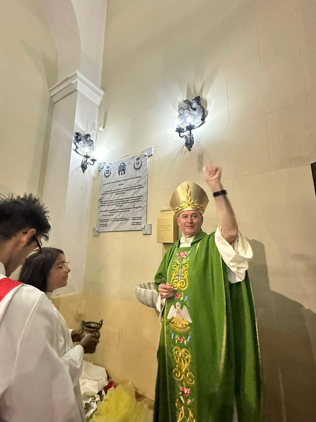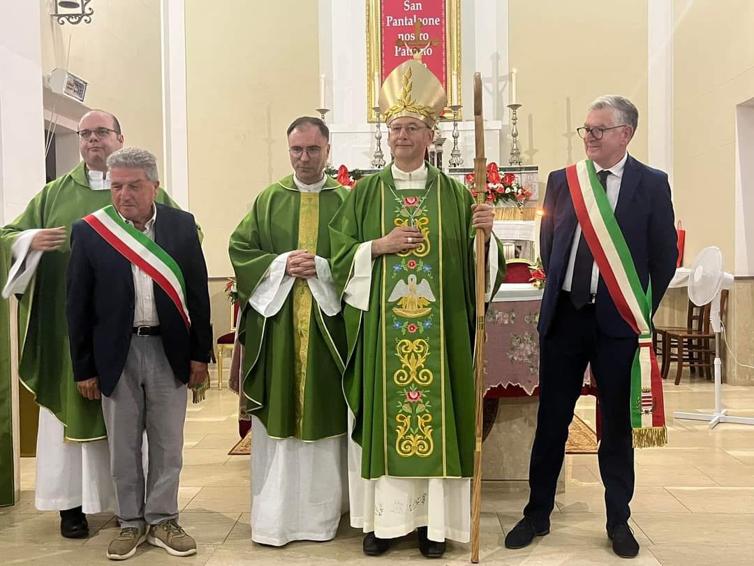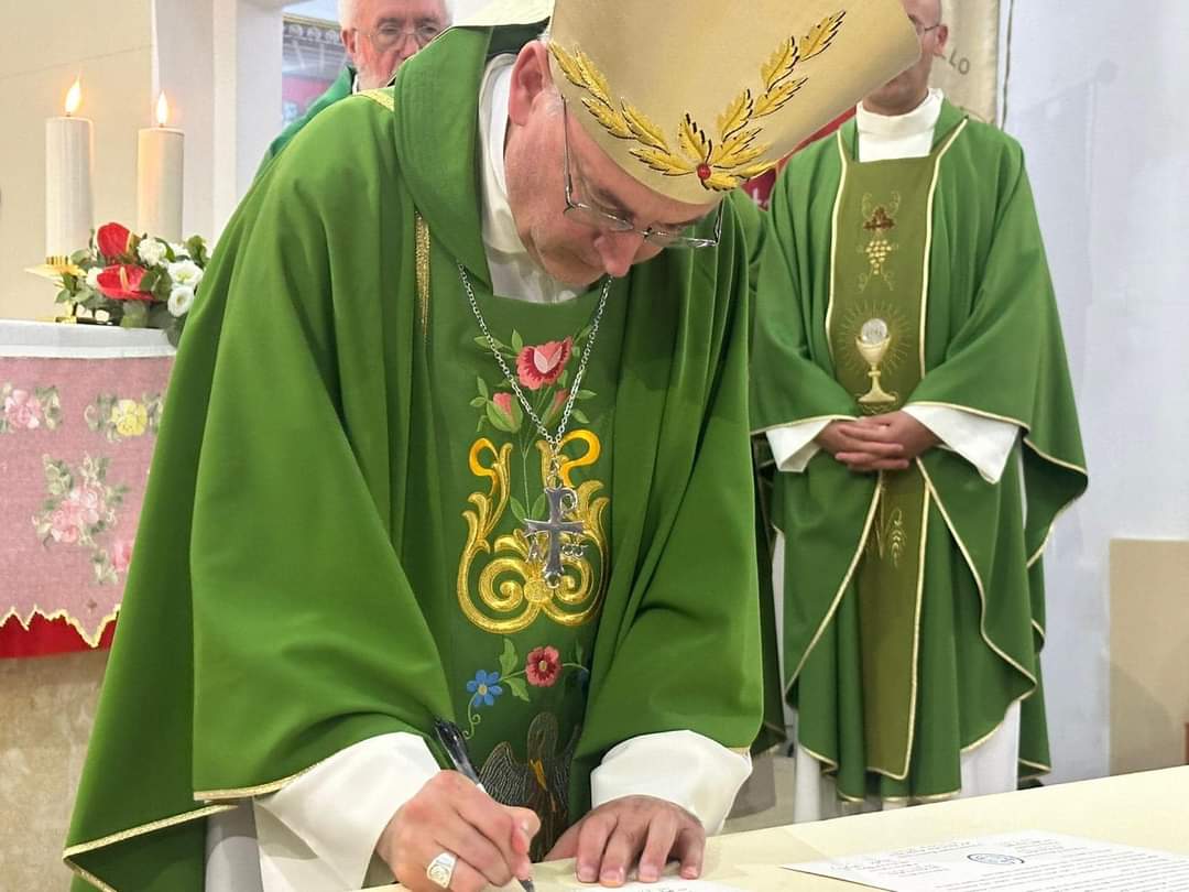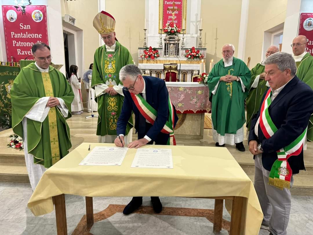 Subito dopo il Convegno si è celebrata la Solenne Eucaristia nella Chiesa Parrocchiale presieduta da S. E. Mons. Giuseppe Alberti alla fine della quale si è firmato il Patto di Amicizia tra le due Città su pergamena di Amalfi e si è inaugurata una lastra marmorea in ricordo dell’evento.