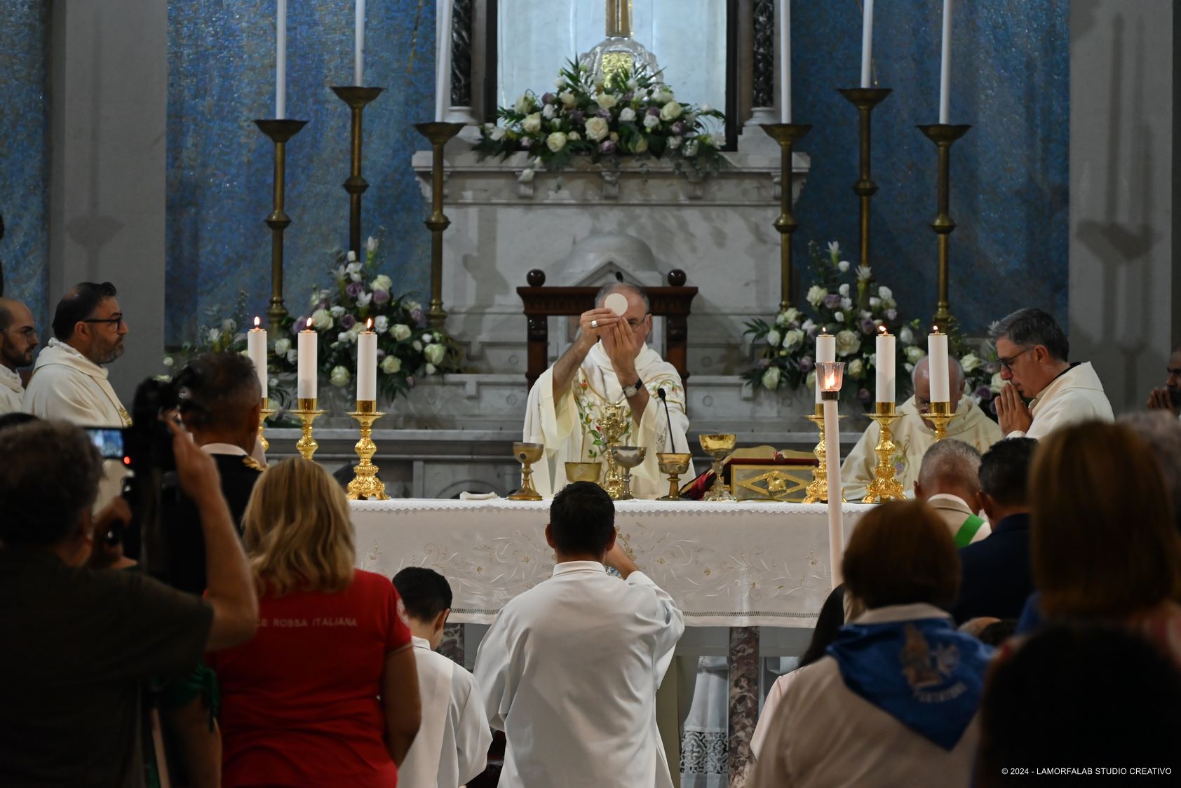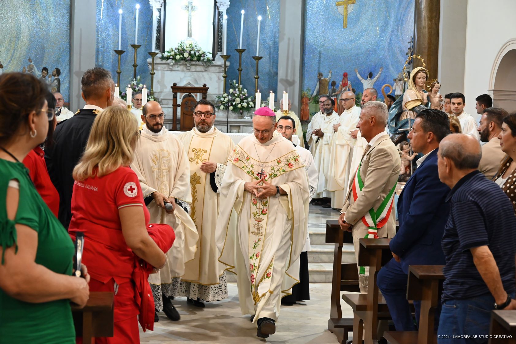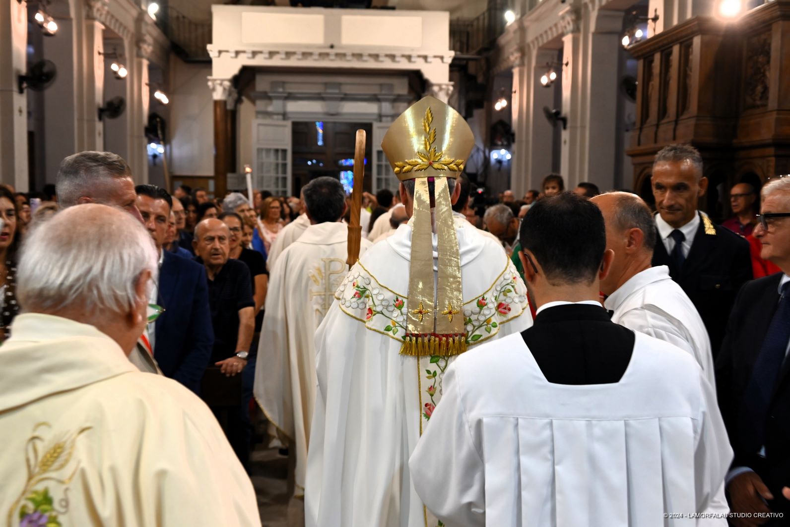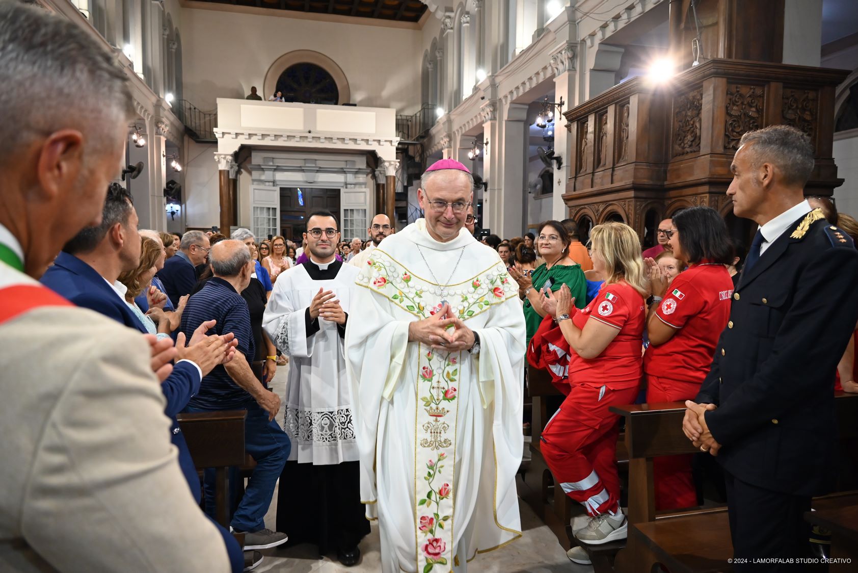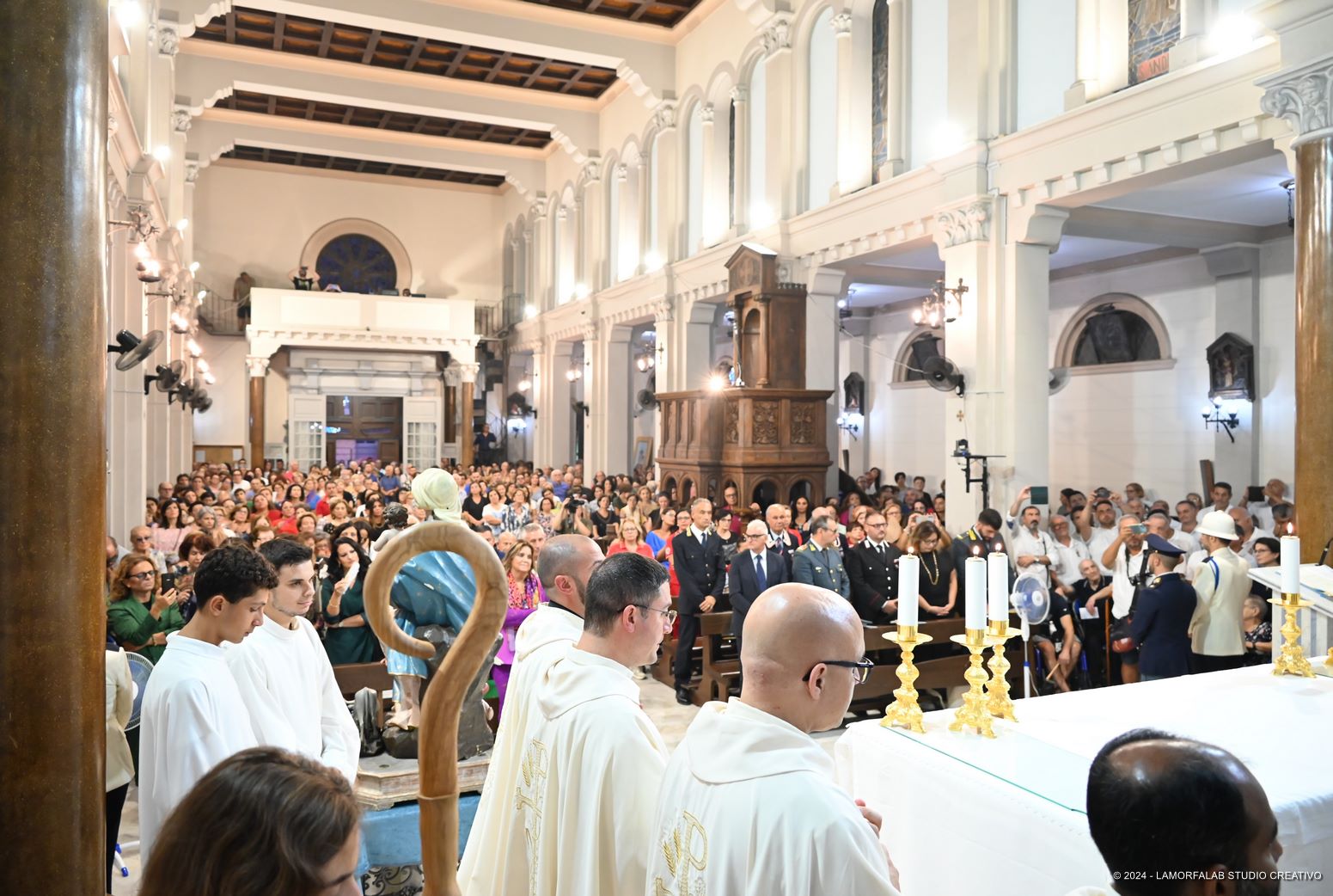 Presenti alla Celebrazione le più alte cariche civili e militari del territorio oltre ai tanti sacerdoti, religiosi e diaconi della diocesi. Presenti i collaboratori della parrocchia e della città che hanno costituito, in quest’anno di preparazione, il “comitato dei 130 anni” e i tanti fedeli della città che hanno riempito la Chiesa e la piazza antistante seguendo la Celebrazione sul maxischermo.