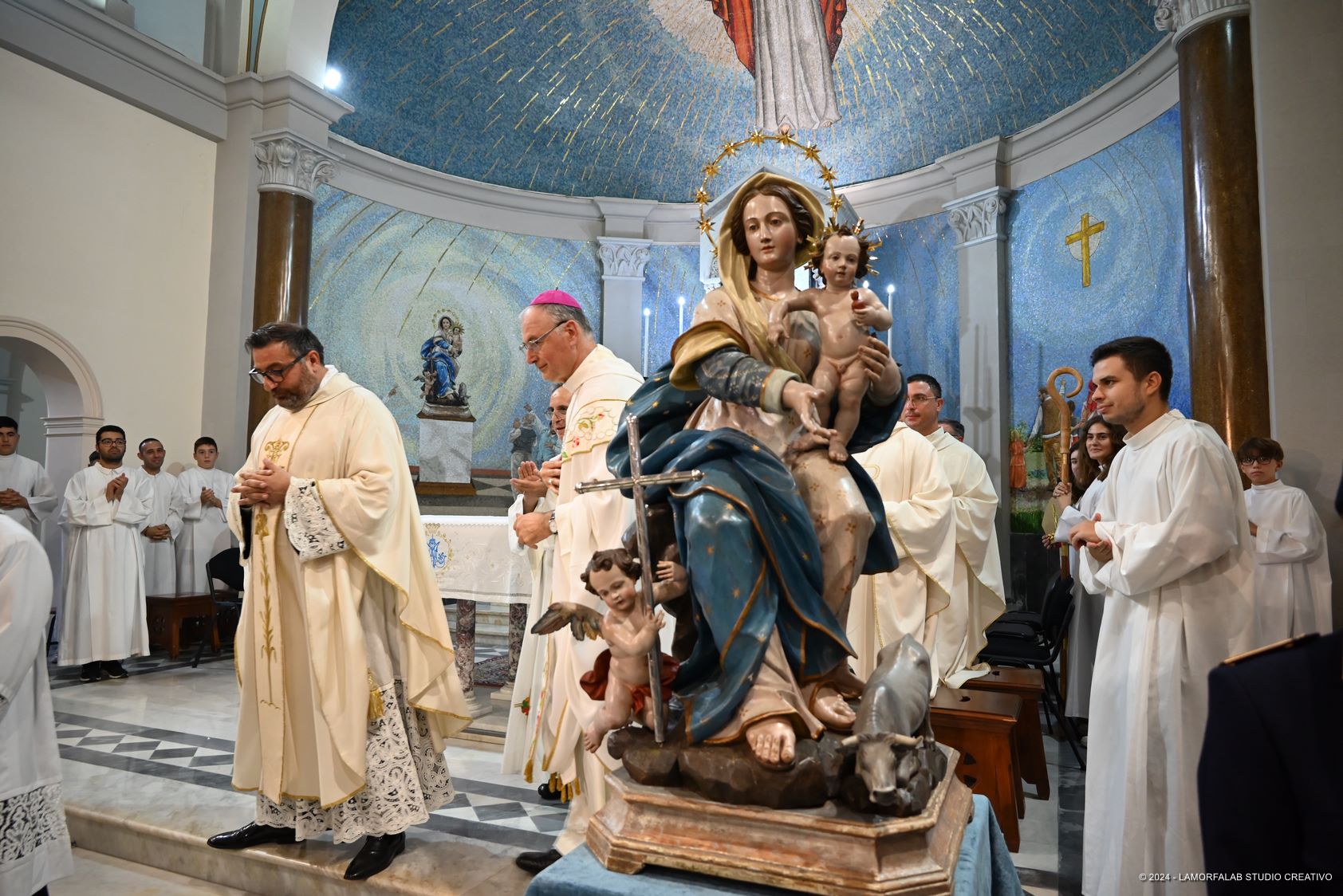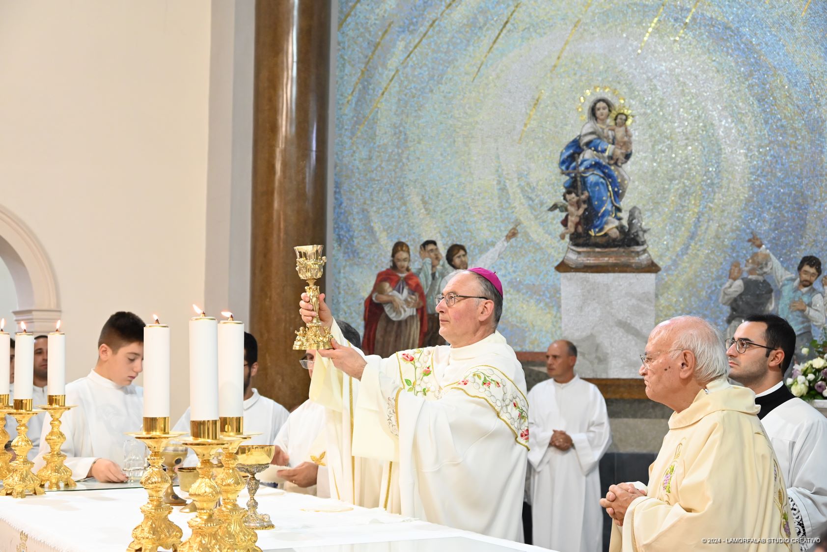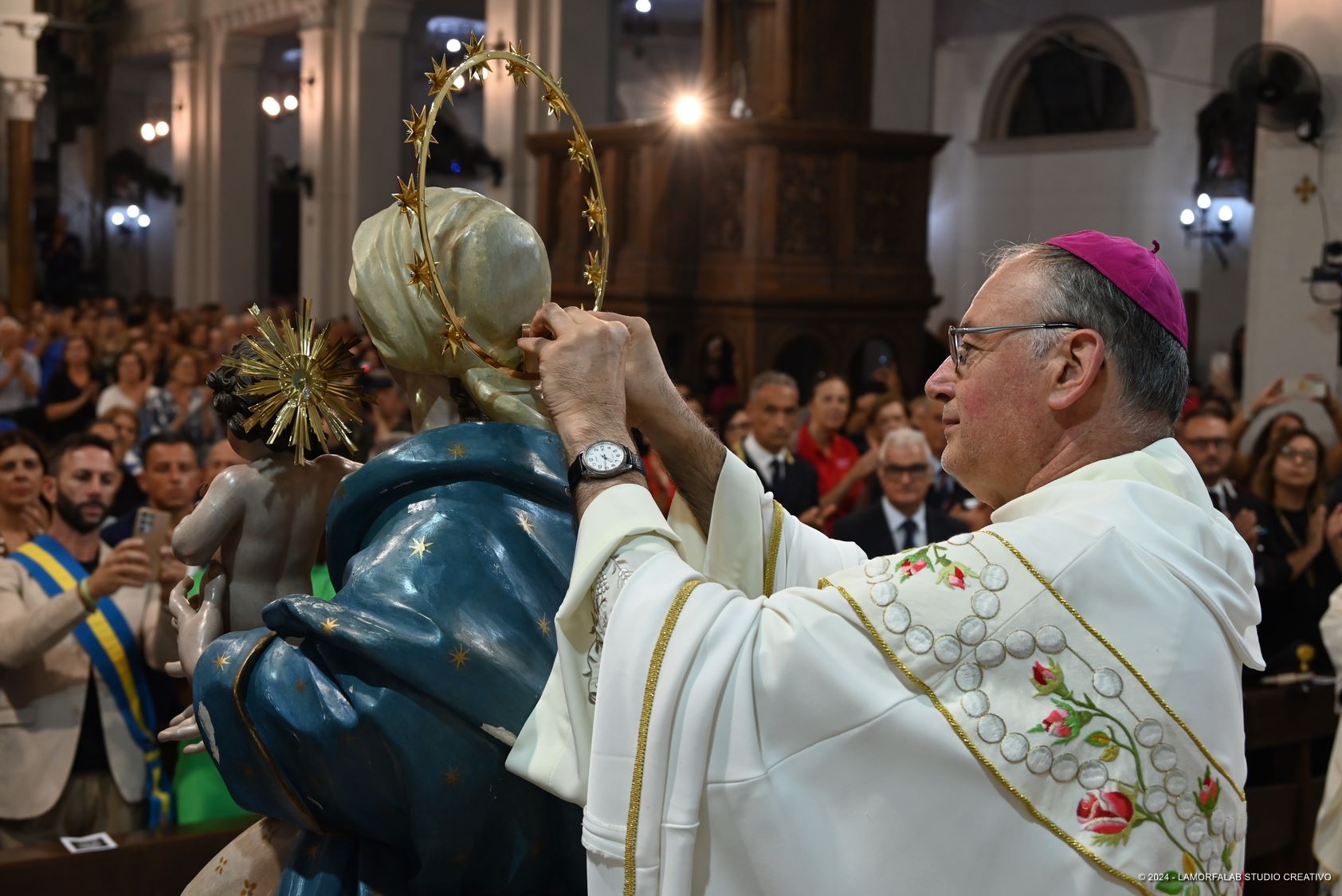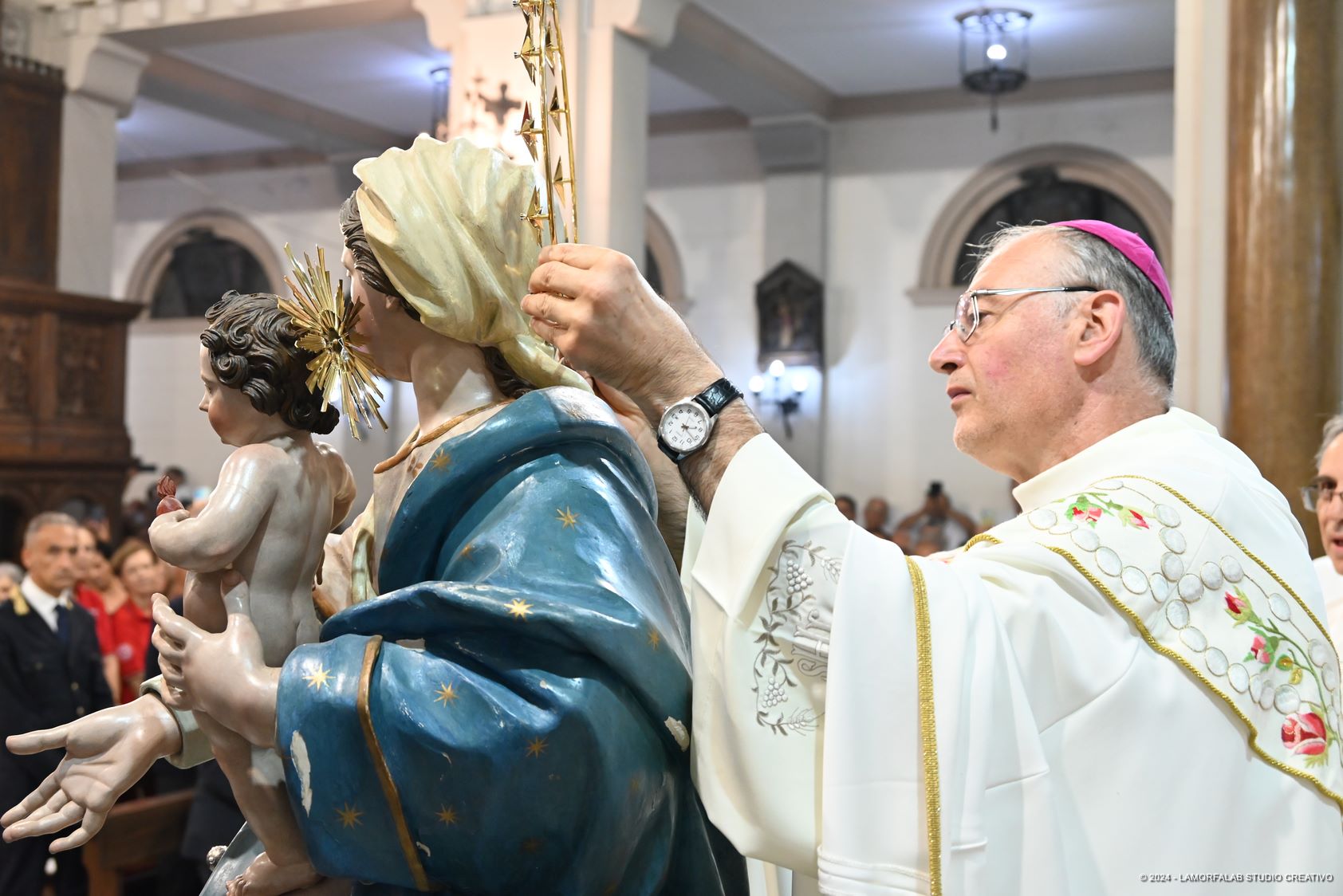 Il vescovo mons. Giuseppe Alberti ha presieduto la Solenne Concelebrazione Eucaristica, in cui è stato posto sul capo della Madonna lo stellario, benedetto da Papa Francesco, realizzato con la fusione dell’oro e dell’argento offerto dai fedeli, e per primo ha attraversato la porta con cui ha avuto inizio l’anno giubilare nel giorno in cui si sono celebrati i 130 anni dai Miracoli.