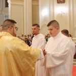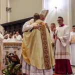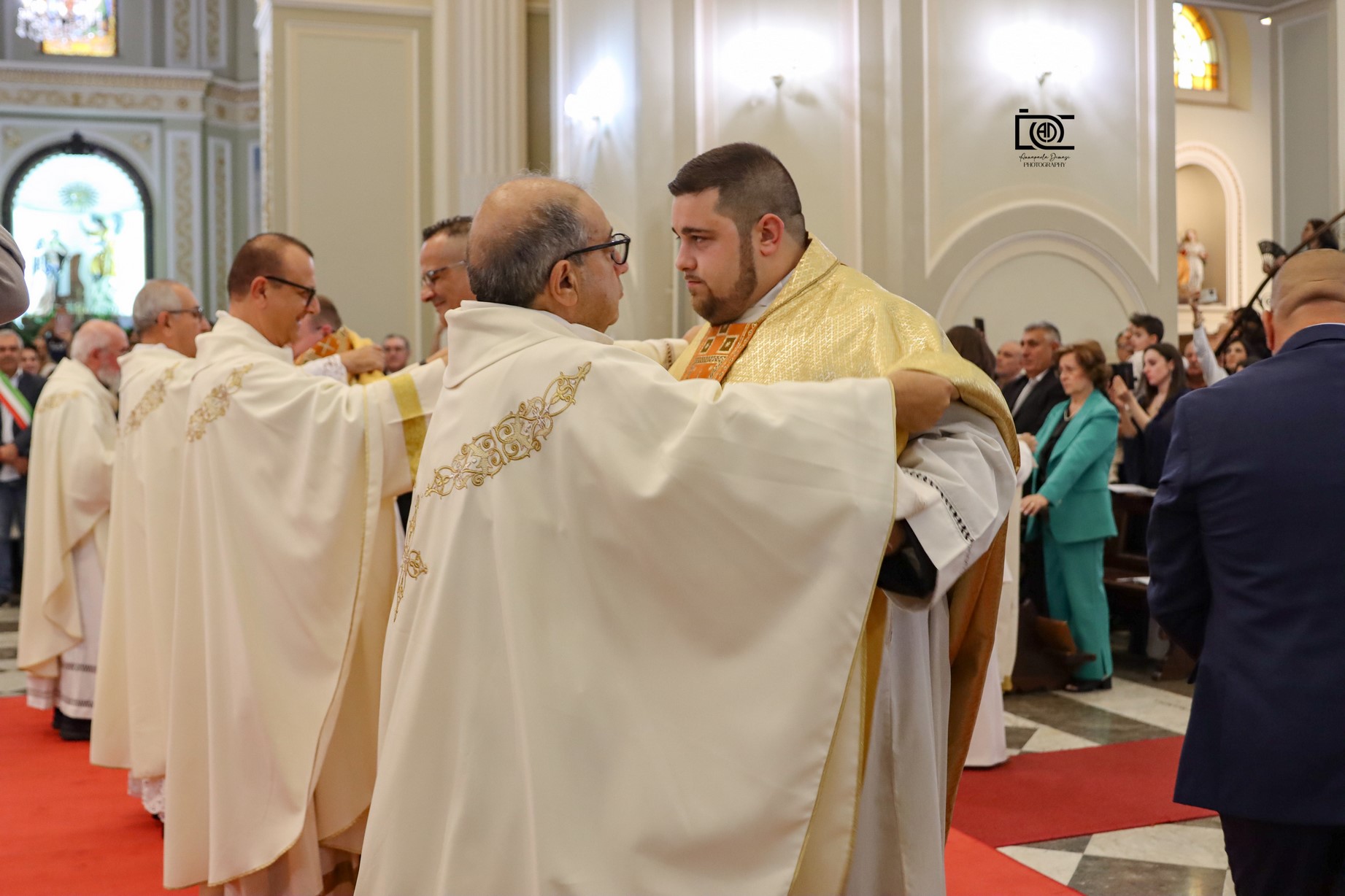 Dopo l’omelia, gli ordinandi, si sono prostrati a terra al centro del presbiterio, mentre il canto delle litanie dei santi, ha preparato l’assemblea a vivere il momento della consacrazione con l’imposizione delle mani del nostro Vescovo e di tutti gli altri sacerdoti. Terminata la preghiera di ordinazione, gli ordinati si sono alzati e i presbiteri a loro cari li hanno aiutati a rivestire la stola al modo sacerdotale e la casula; è seguito l’abbraccio di pace con tutti i sacerdoti della Diocesi e con i genitori e i famigliari più intimi: momenti suggestivi e sempre colmi di emozione e commozione.