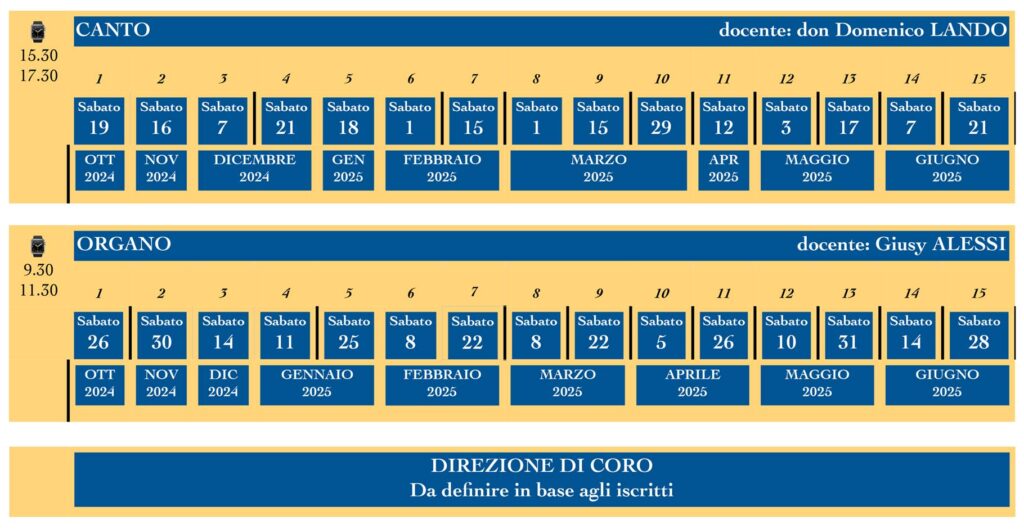 Le lezioni di musica si svolgeranno il sabato dalle 14.30 alle 17.30, ad eccezione del corso di organo, che avrà luogo alle 9.30.