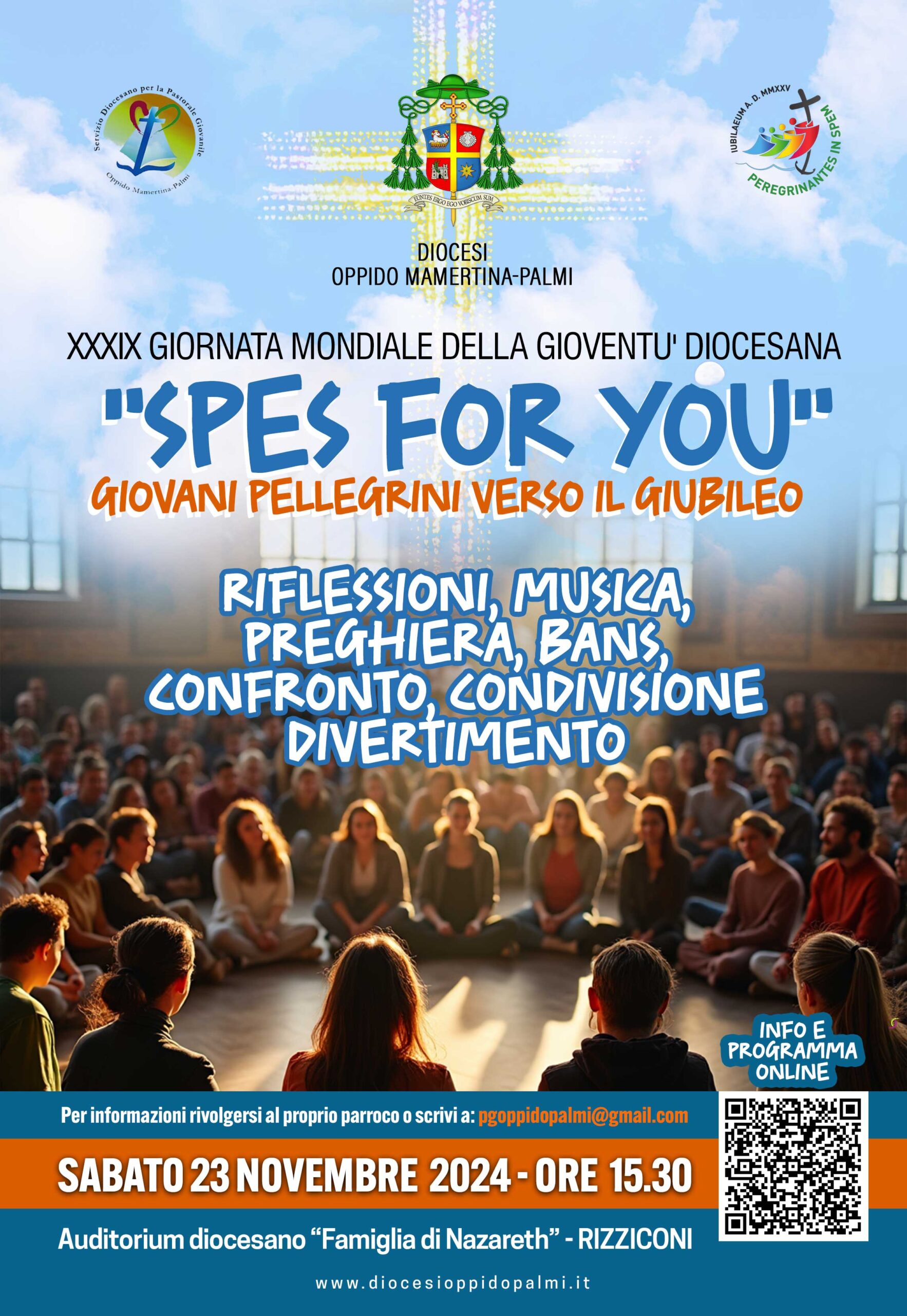 La Diocesi di Oppido Mamertina-Palmi è lieta di celebrare la XXXIX Giornata Mondiale della Gioventù Diocesana, un’occasione unica di incontro e spiritualità per tutti i giovani del nostro territorio. Questo evento annuale è un momento di riflessione, di preghiera, e di gioia condivisa, che permette ai giovani di approfondire il loro cammino di fede e di prepararsi al prossimo Giubileo. Quest’anno il tema scelto è “Spes For You – Giovani Pellegrini verso il Giubileo”, un invito a scoprire la speranza attraverso l’incontro con Dio e con gli altri, in un contesto di spiritualità e condivisione.
