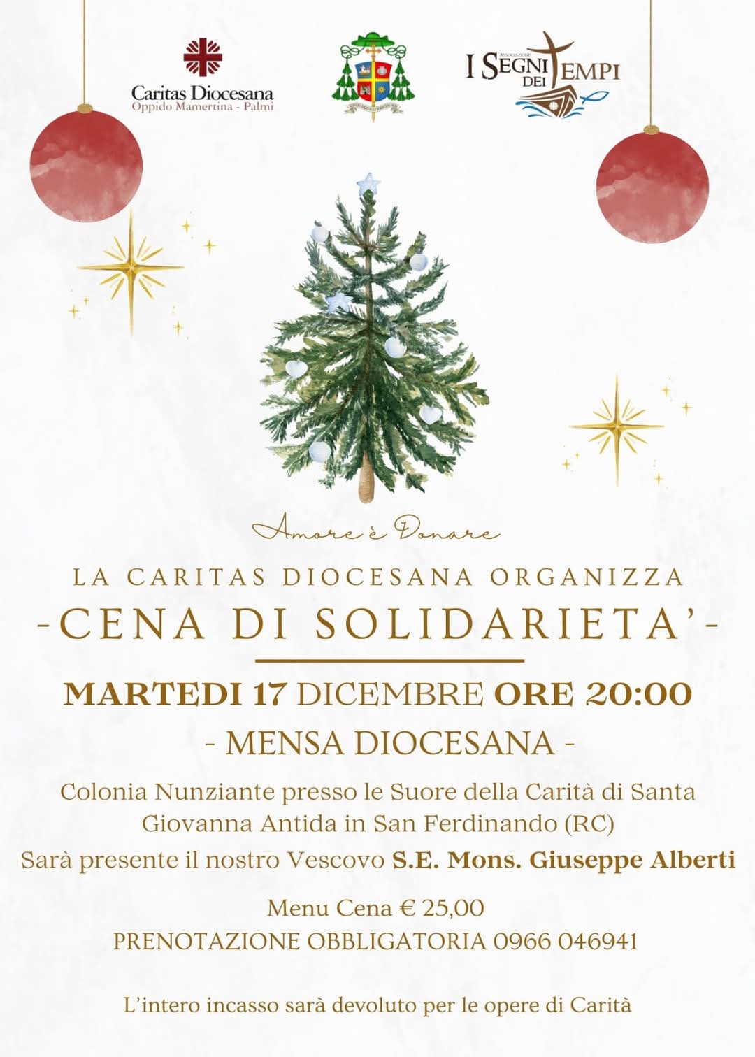 Martedì 17 dicembre, la Mensa Diocesana di San Ferdinando ha ospitato una cena solidale organizzata dalla Caritas Diocesana di Oppido Mamertina Palmi, riunendo, in un’atmosfera di calore e fraternità, un centinaio di persone. L’iniziativa ha avuto come scopo la raccolta di fondi da destinare per il sostegno delle opere di carità, una nota melodiosa in un periodo significativo come quello dell’Avvento.