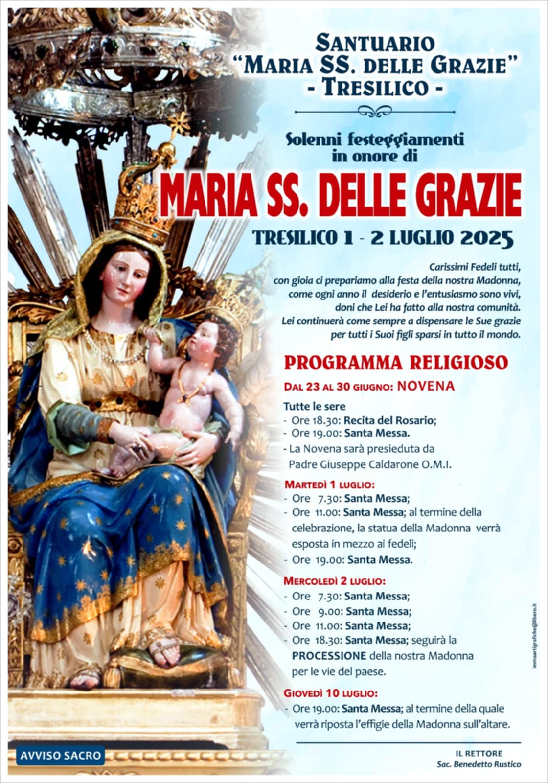 Nel cuore dell’anno giubilare che la nostra Diocesi sta vivendo con particolare intensità spirituale, il Santuario di Tresilico, dedicato a Maria Santissima delle Grazie, è stato scelto come chiesa giubilare. Un segno tangibile della materna presenza della Vergine tra il suo popolo, che con fede si raccoglie ai suoi piedi per invocare grazie e misericordia.