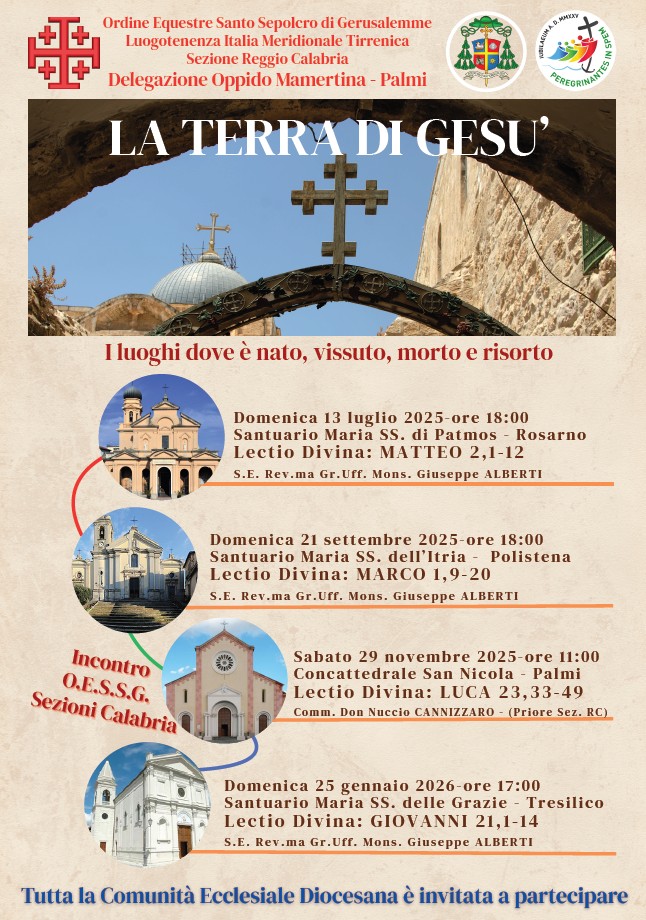 La Delegazione Oppido Mamertina-Palmi dell’Ordine Equestre del Santo Sepolcro di Gerusalemme, appartenente alla Luogotenenza per l’Italia Meridionale Tirrenica, promuove un significativo ciclo di incontri spirituali intitolato “La Terra di Gesù”.