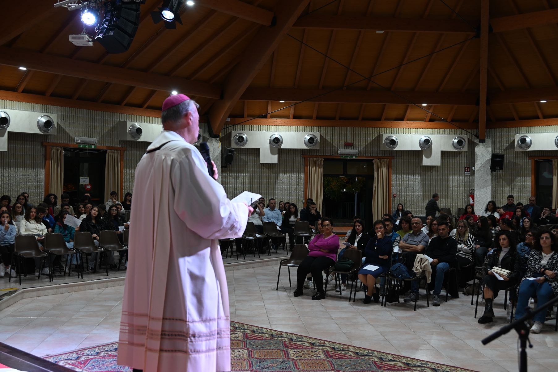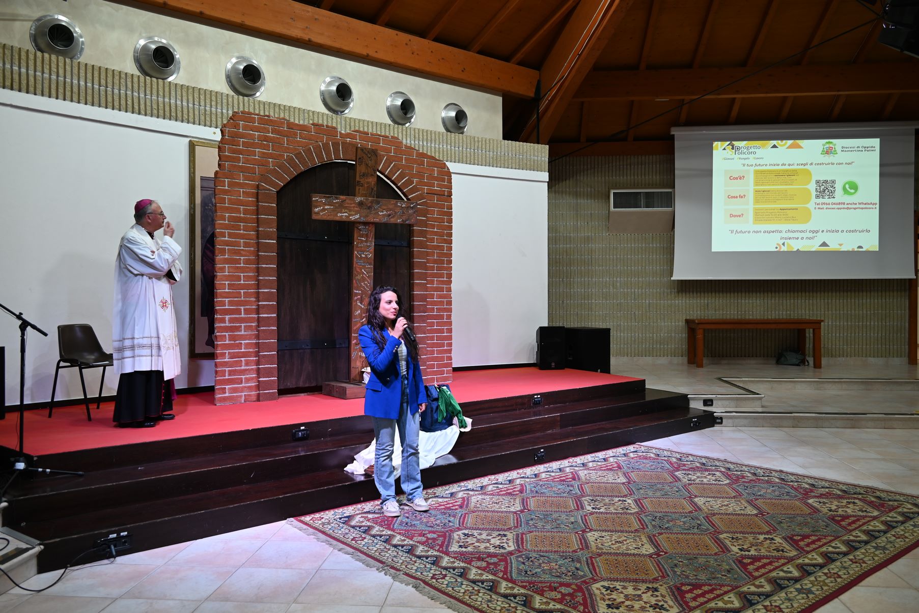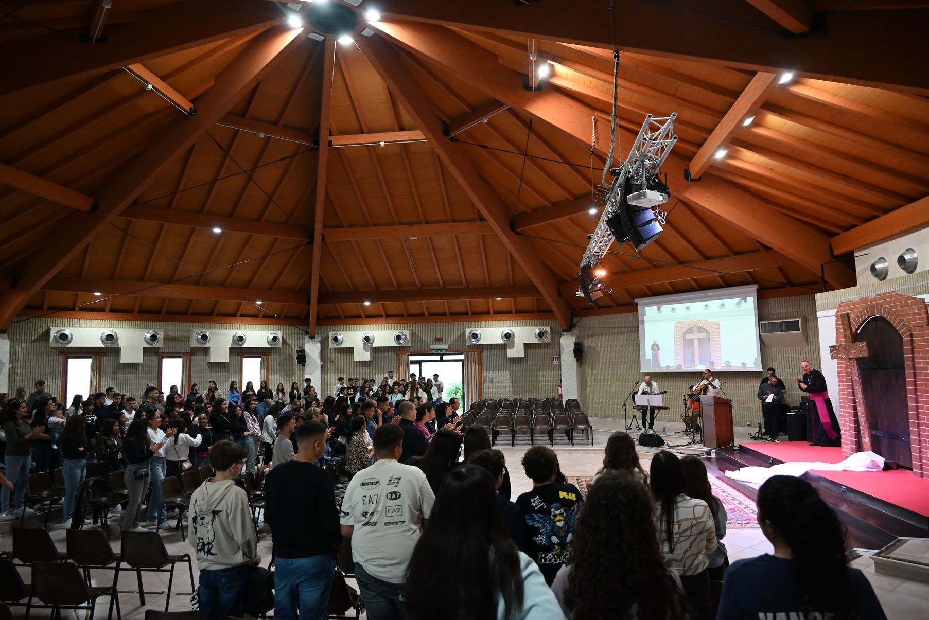 I primi arrivi sono stati accolti alle ore 17, seguiti dall’ingresso solenne del Vescovo, accompagnato da una rappresentanza di ragazzi che hanno portato la croce, posta simbolicamente al centro del palco, segno forte e visibile del cammino comune.