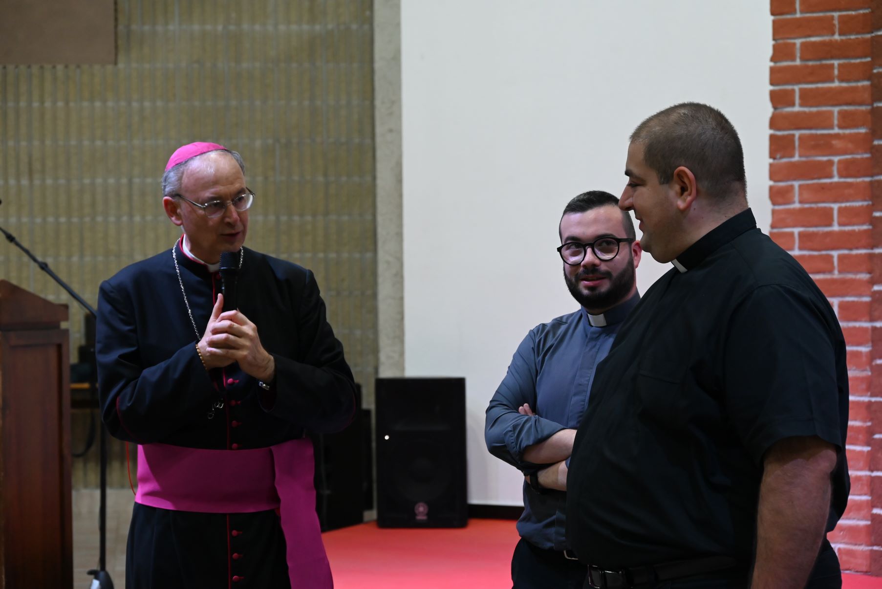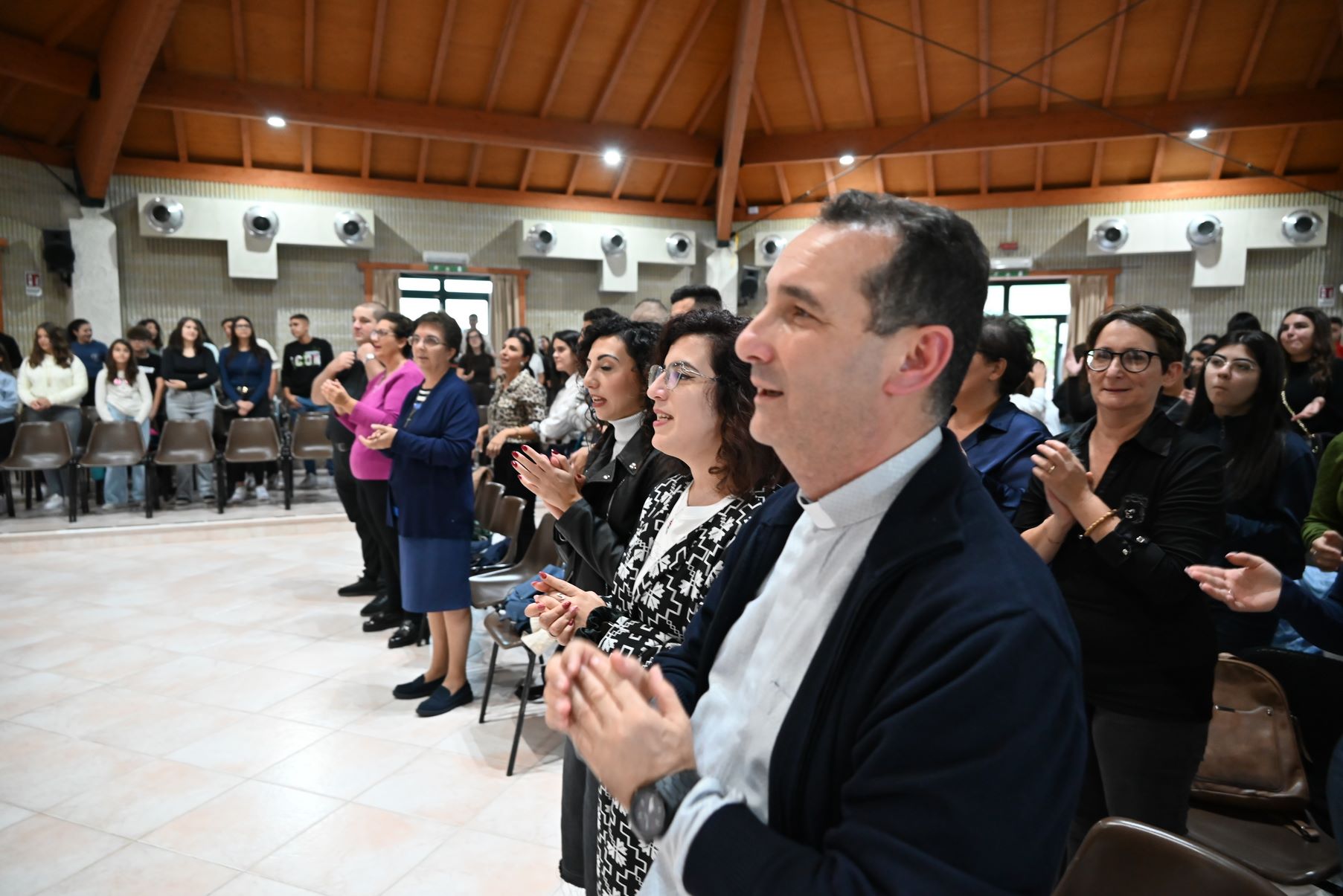 Ad aprire il momento di dialogo è stato don Filippo Attanà, che ha guidato i giovani in una riflessione sul senso del Giubileo e mediante un dialogo è emerso un messaggio chiaro: l’esperienza vissuta a Roma deve continuare ad illuminare i passi della vita quotidiana di ciascun giovane. Il Giubileo infatti non è finito, ma continua dentro il cuore di ognuno. A seguire, Don Giovanni Rigoli e Giusy Morfea, entrambi della equipe di PG diocesana, hanno curato la presentazione ufficiale del direttore uscente, don Francesco Muratori e di quello entrante della Pastorale Giovanile diocesana, don Domenico Lamanna. Questo momento ha segnato un passaggio di testimone importante per il futuro del servizio ai giovani in diocesi.