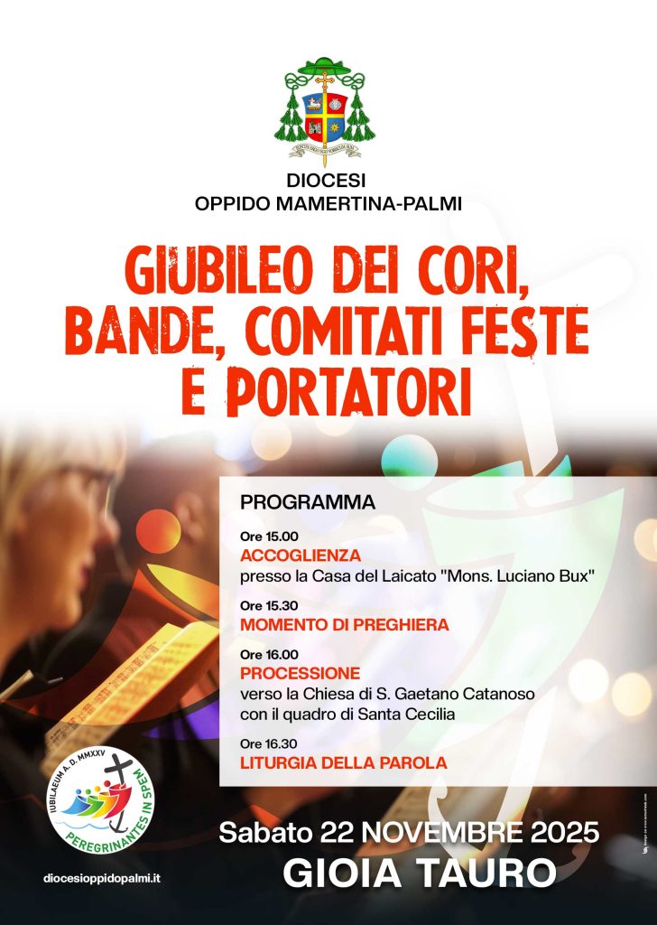 Per sperimentare e accrescere tale consapevolezza, desidero invitare i membri dei Comitati Feste, dei Portatori, delle Bande e dei Cori presenti in Diocesi alla celebrazione giubilare che si terrà sabato 22 novembre p.v. – memoria di Santa Cecilia, Patrona della musica, dei musicisti e dei cantanti – secondo il seguente programma:
