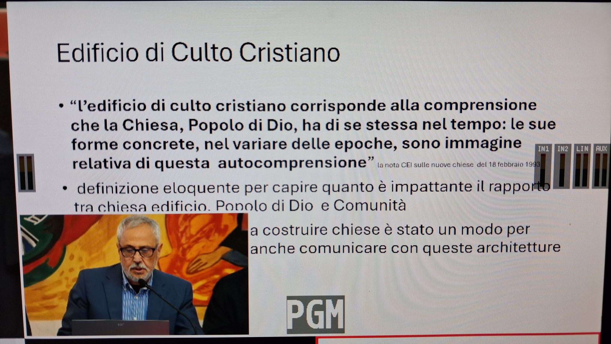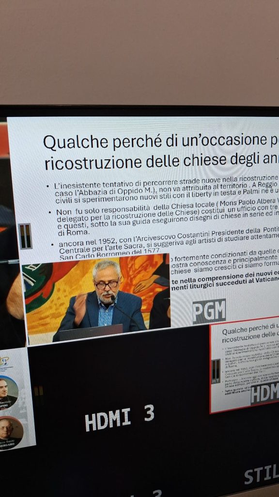 Con il suggestivo e solido intervento dell’ing. Paolo Martino, la sessione entra nel “visibile”: chiese nuove e adeguamenti liturgici nella Piana durante e dopo il Concilio. L’ing. Martino prepara opportunamente il terreno con due passaggi: il senso dell’edificio cristiano e un percorso storico locale, mirabilmente tracciati. Il presupposto è chiaro: «la chiesa-edificio non è neutra; è un linguaggio con cui la Comunità parla a sé stessa e al mondo e nella Storia cristiana ha scandito tappe e spazi del cammino di fede (annuncio, conversione, battesimo, vita nuova)».