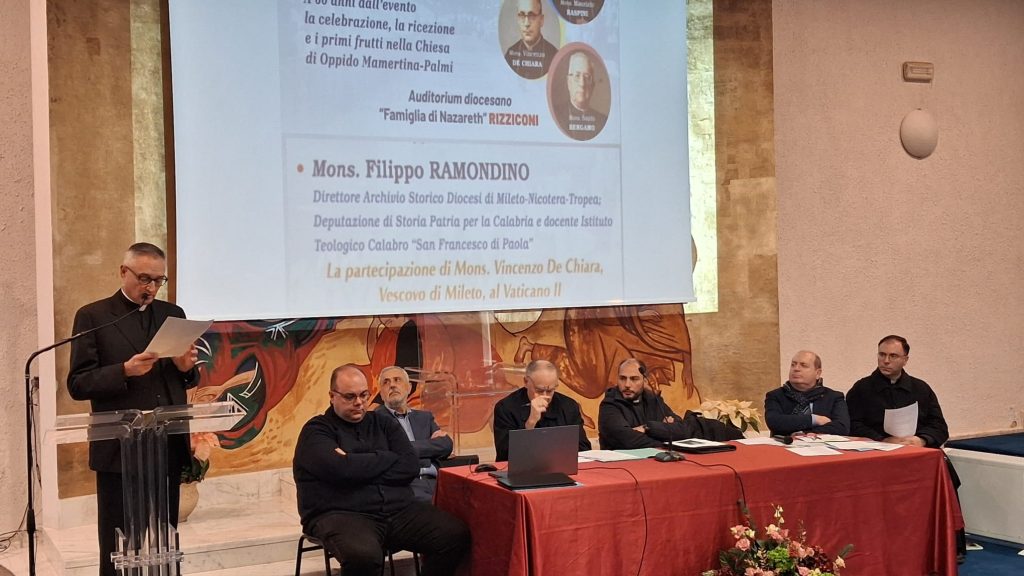 La seconda relazione amplia l’orizzonte con le altre radici della Storia della nostra Diocesi: mons. Filippo Ramondino, direttore dell’Archivio storico della Diocesi di Mileto-Nicotera-Tropea, con solidità di documenti e scorrevolezza d’eloquio, presenta l’esperienza di mons. Vincenzo De Chiara, vescovo di Mileto al Vaticano II, collocandolo nel “passaggio epocale” che la Gaudium et Spes avrebbe esplicitato: dalla concezione statica a quella dinamica ed evolutiva della vita ecclesiale.