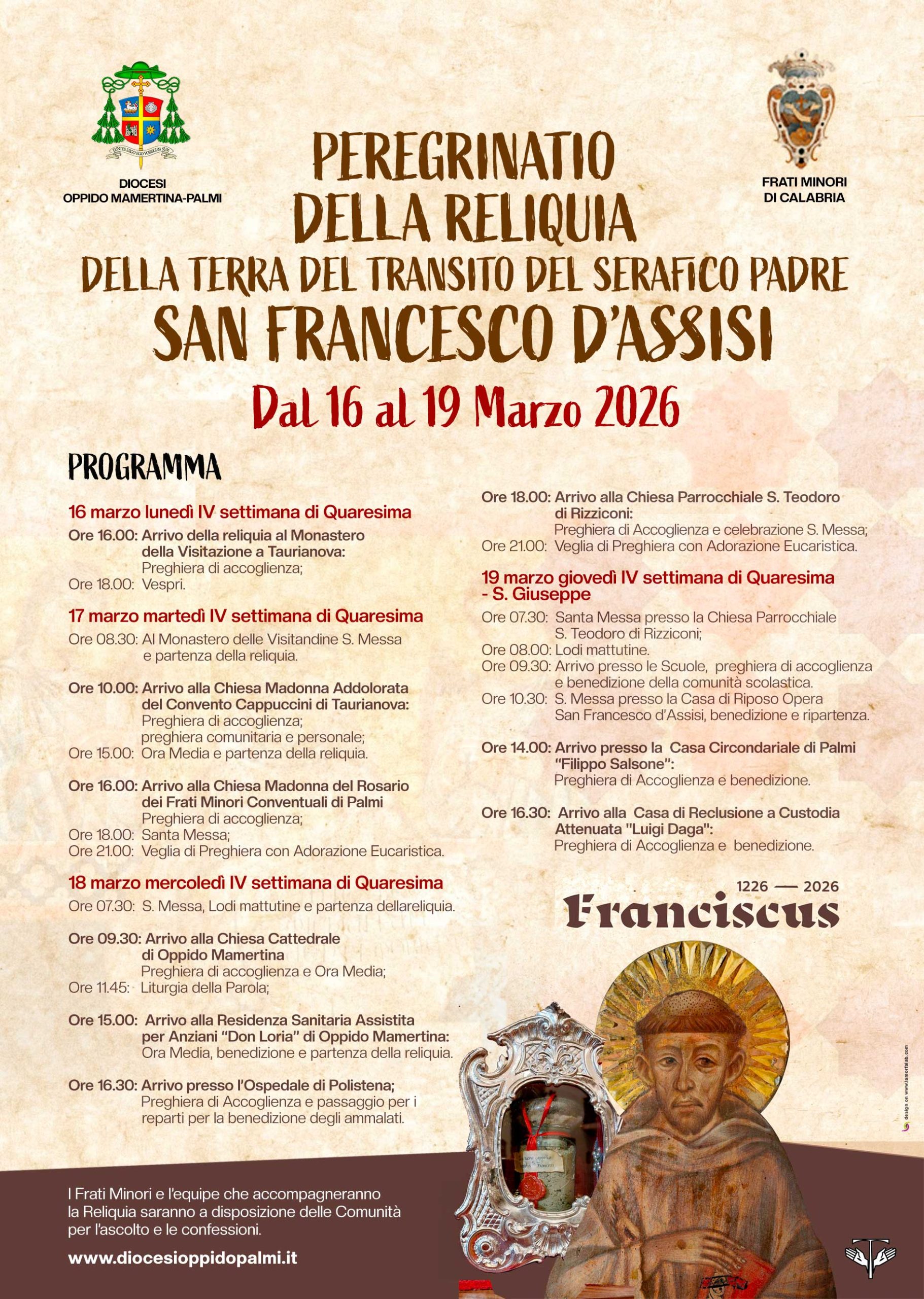 I Frati Minori e l’equipe che accompagneranno la Reliquia saranno a disposizione delle Comunità per l’ascolto e le confessioni.