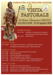 Giorno 21 giugno alle ore 18:30 il Vescovo, S. E. Mons. Francesco Milito, si è recato presso la Parrocchia “San Procopio” in San Procopio per la Visita Pastorale. Egli è stato accolto sul sacrato della chiesa parrocchiale dal Parroco, don Domenico Zurzolo, dal diacono collaboratore Rosario Carrozza, dal Sindaco da poco eletto e da alcuni rappresentanti della comunità parrocchiale in un clima di sincera gioia e gratitudine al Signore.