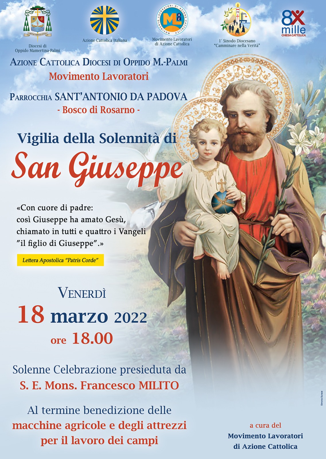 Celebrazione Eucaristica presieduta da S. E. Mons. Francesco Milito per con il Movimento Lavoratori di Azione Cattolica presso la Parrocchia “Sant’Antonio di Padova” in Bosco di Rosarno con al termine benedizione delle macchine agricole e degli attretti per il lavoro dei campi
