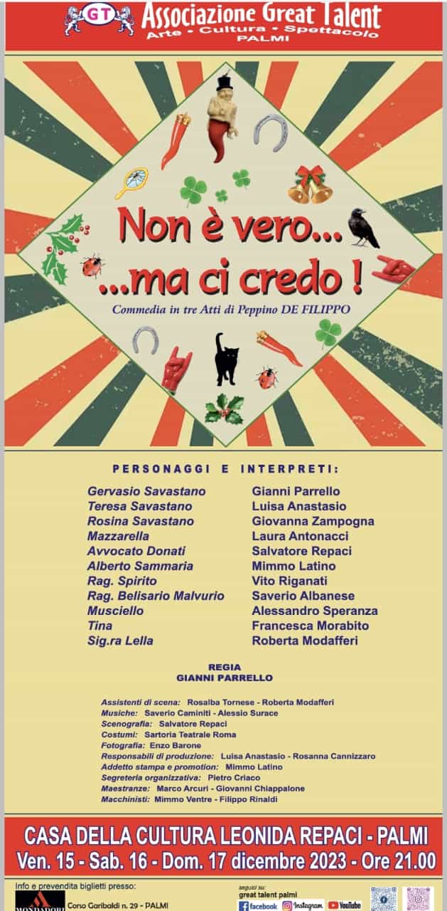 Presenza del Vescovo Mons. Alberti alla rappresentazione teatrale “Non è vero … ma ci credo!” dell’Associazione Great Talent presso la Casa della Cultura “Leonida Repaci” di Palmi